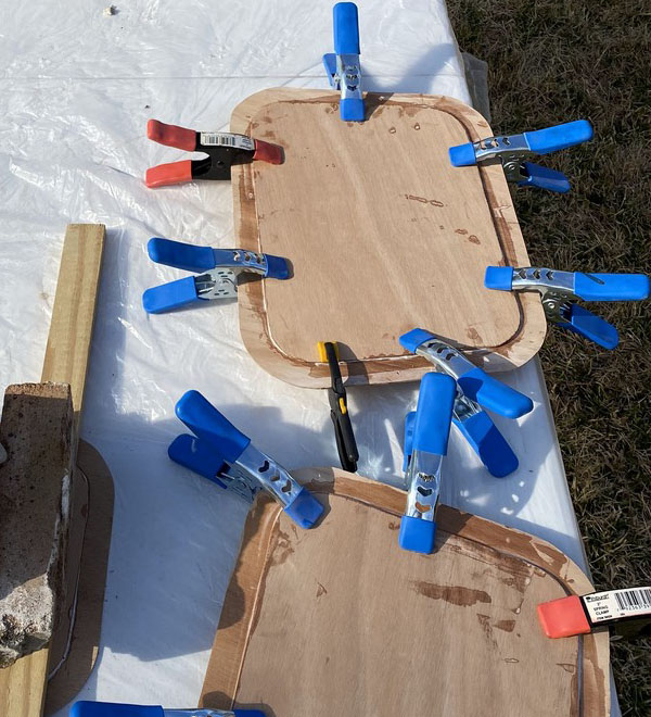 There it is… This “oval of clamps” photo is proof I’m on the back end of the curve. The kayaks really look like kayaks now.