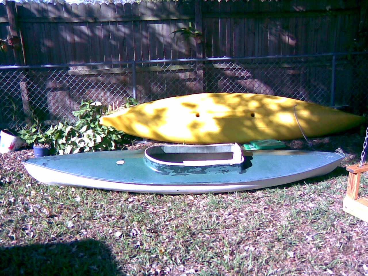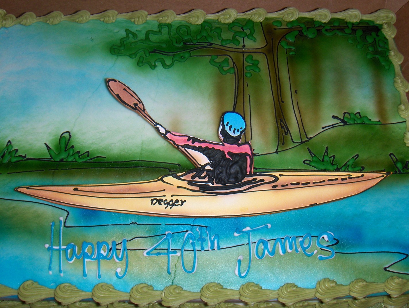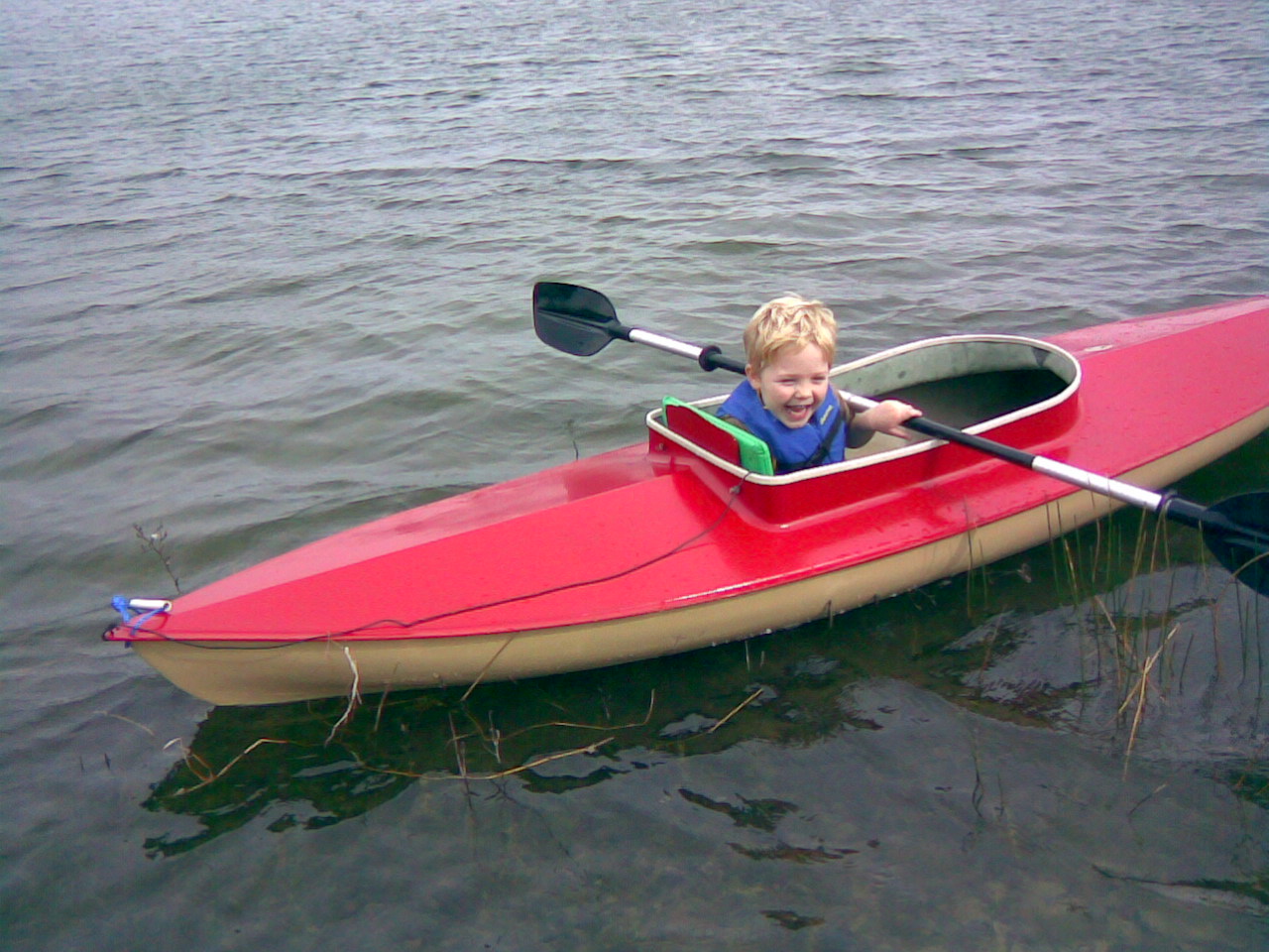 These thumbnails enlarge when you click them. Pictured are my first two kayaks. You’ll see one of my sons as a baby sitting in a friend’s touring kayak, a kayak drawn in cake icing on occasion of my 40th birthday, a nephew enjoying the Hillsboro River on my Dagger Cayman sit-on-top, and photos of a short and beamy, old fiberglass boat by a builder in Martha’s Vineyard which I repainted.