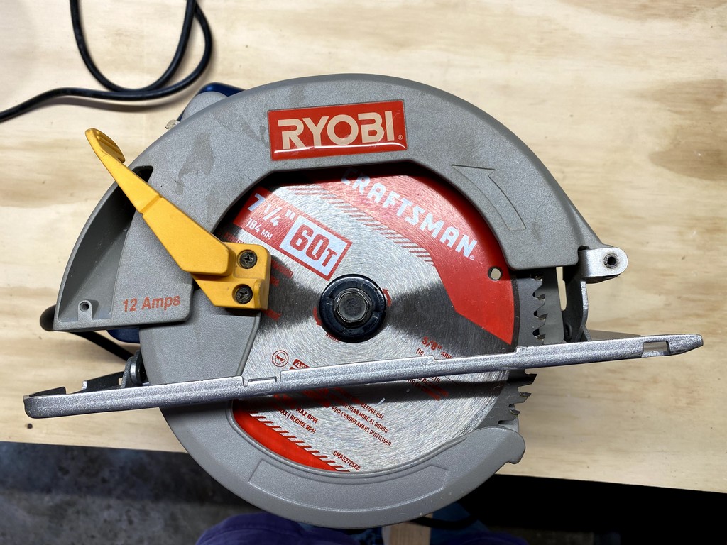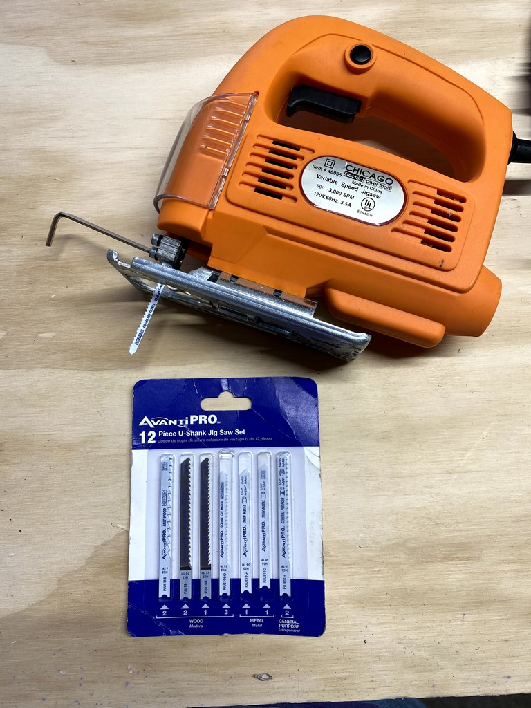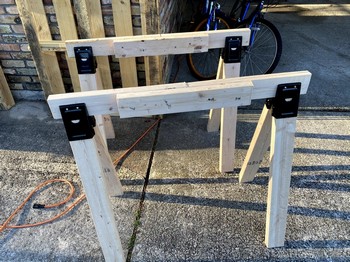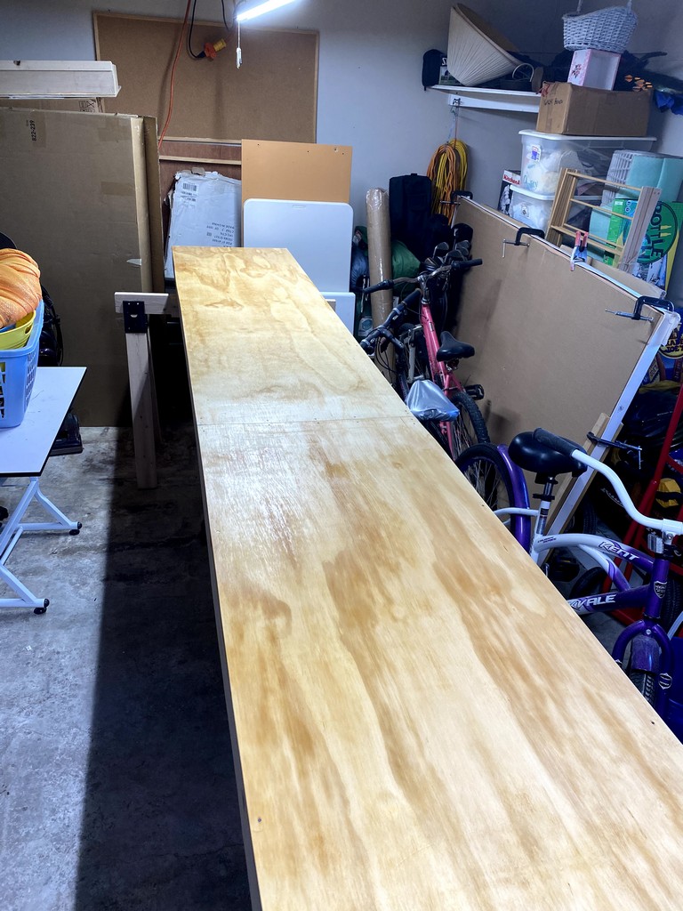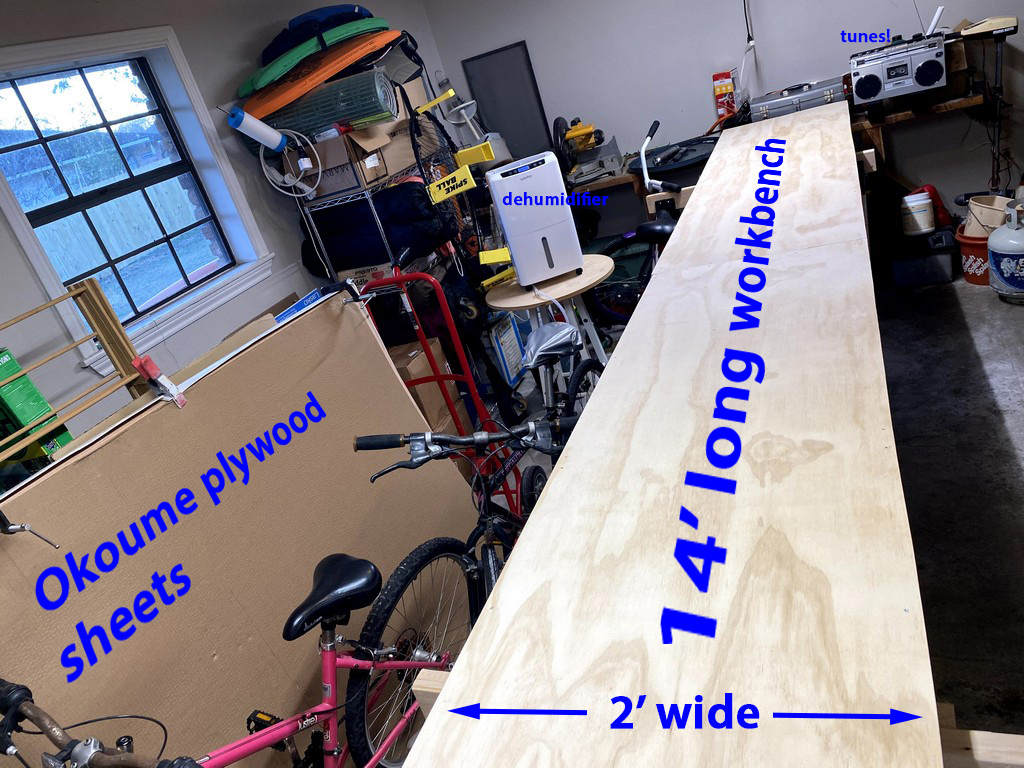 One needs a long, narrow work table on which to cut out and assemble these long and sometimes delicate plywood components into the pieces for a hull and deck. Using one sheet of 11/32 plywood and some 2 x 4s, I built a 14’ x 2’ table resting on three saw horses. Care was taken to ensure the table was level and flat. Fourteen feet is 6" shorter than the final length of the Shearwater Sport, so if you’ve got the room I recommend building the table 15’ in length. Others also tend to use thicker plywood. My workshop is pressed for space so I elected to go shorter and lighter. Below are photos of the finished workbench and some of the tools I’ll be using.