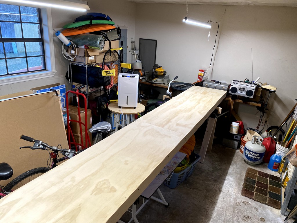 With that test passed, I spent several weekends removing boxes, bins and furniture from this room. I purchased a dehumidifier to try to address the humidity problem caused by moisture seeping up through the concrete slab, and I hung two 4’ LED shop lights from the ceiling. I’ve still got a ways to go finding a new home for some of this stuff.