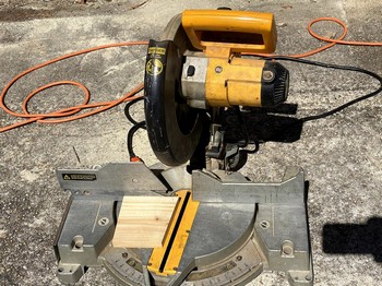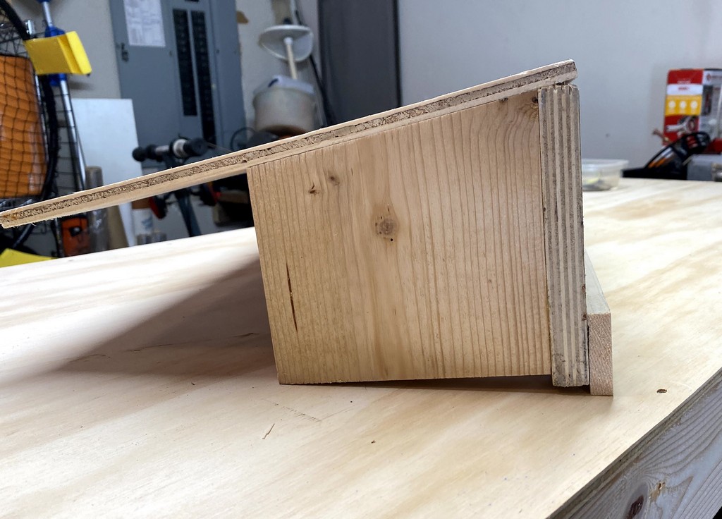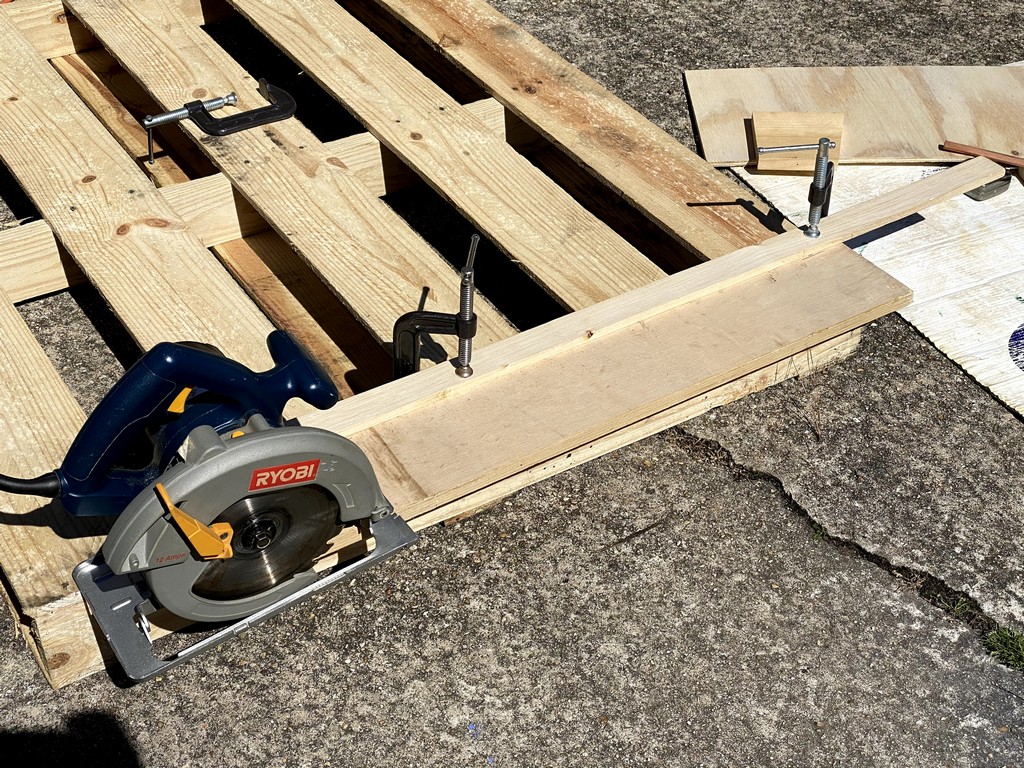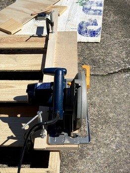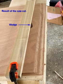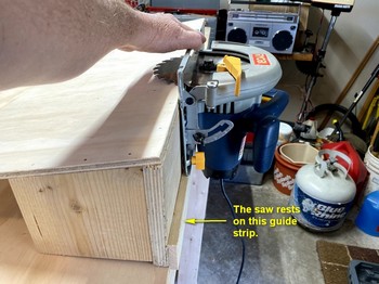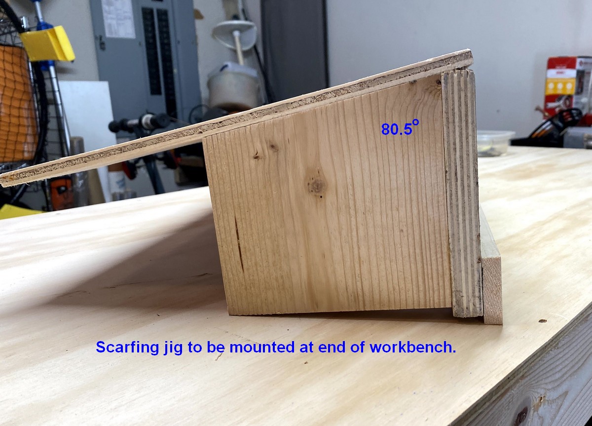 Vaclav of One Ocean Kayaks presents an alternative to the block plane for cutting scarfs: by using a sharp circular saw and a “scarfing jig.” I chose this method because I don’t trust my ability to stay uniform with the block plane. The jig was constructed of a scrap from the 3/8" plywood sheet used to construct my work bench, some scrap 1" x 6" lumber as the braces, and one 30" long piece of straight and true hardwood which will be glued and screwed to the plywood as the saw guide. Below are photos of the scarf-jig construction process. The magic acute angle is 80-1/2 degrees.