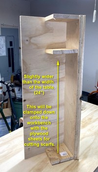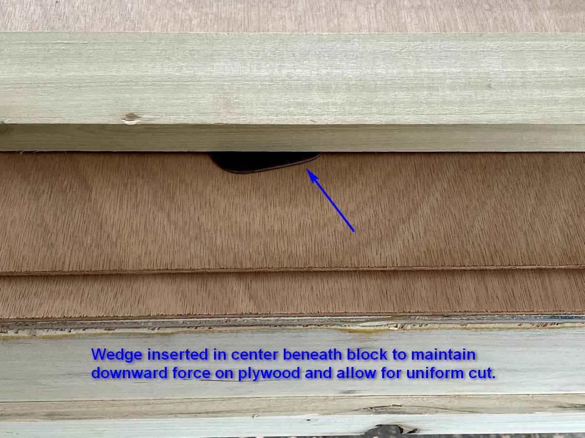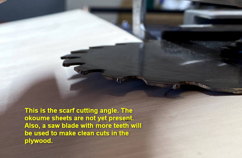 With the sheets of 4mm plywood ripped in half lengthwise, we set up the jig and cut scarfs. The gallery of images below illustrate the process. Following directions in the manual by Vaclav at One Ocean Kayaks we arranged the sheets in pairs with the “good” surfaces facing inward and the top sheet was set back about one inch.