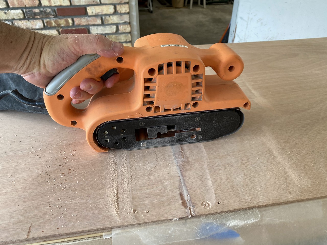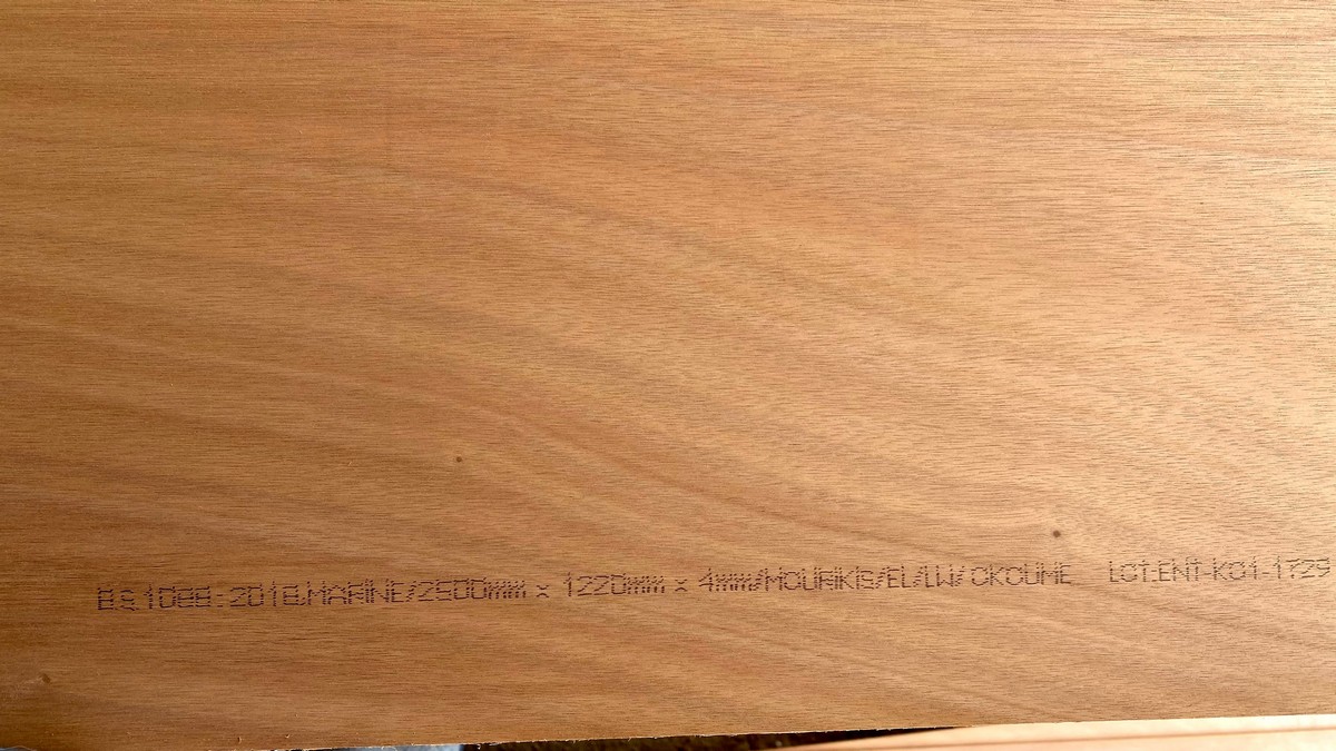 We expanded into the 2-car carport to have room to maneuver the plywood sheets. Those for the hull must be ripped in half lengthwise first, making two 2’ x 8’ sheets. Then, we’ll join these pairs together lengthwise with scarfs. Here is pictured the BS1088 stamp on the plywood I purchased from World Panel.