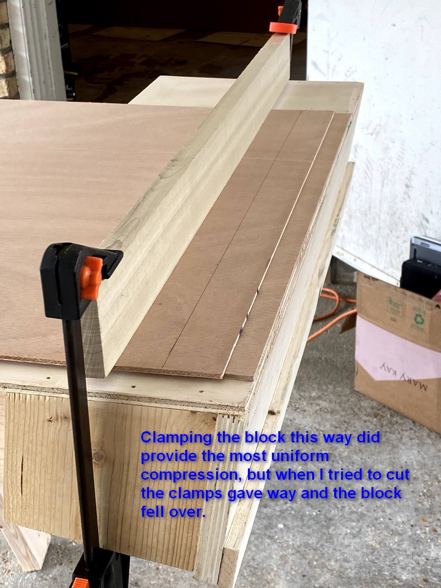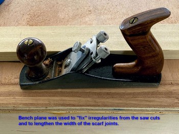 So, with the above lessons learned, we eventually created some acceptable scarf cuts which I improved with my block plane. Most build manuals and forum discussion recommend a low-angle block plane, but I successfully used what I had. Before gluing these pairs together we’ll dry fit them and dress up any severe imperfections with the block plane or belt sander.