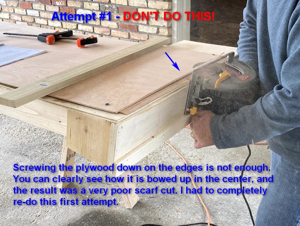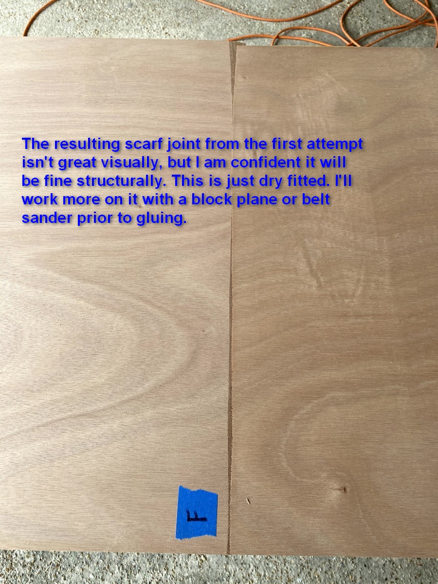 A “scarf” is simply cutting a uniform inclined plane along opposite edges of two panels and bonding them together with glue or epoxy. Many craftsman create scarfs by carefully lining up and clamping down the panels to immobilize them, and then cutting the approximately 2" wide scarf with a sharp block plane. Keeping the layers of the plywood as straight lines in the cut ensures you’re making a uniform cut. Builder discussion forums are loaded with recommendations on which block plane is the best and be assured it is often the most expensive.