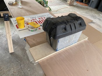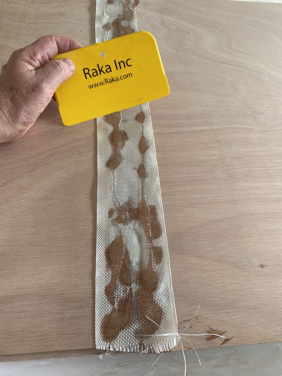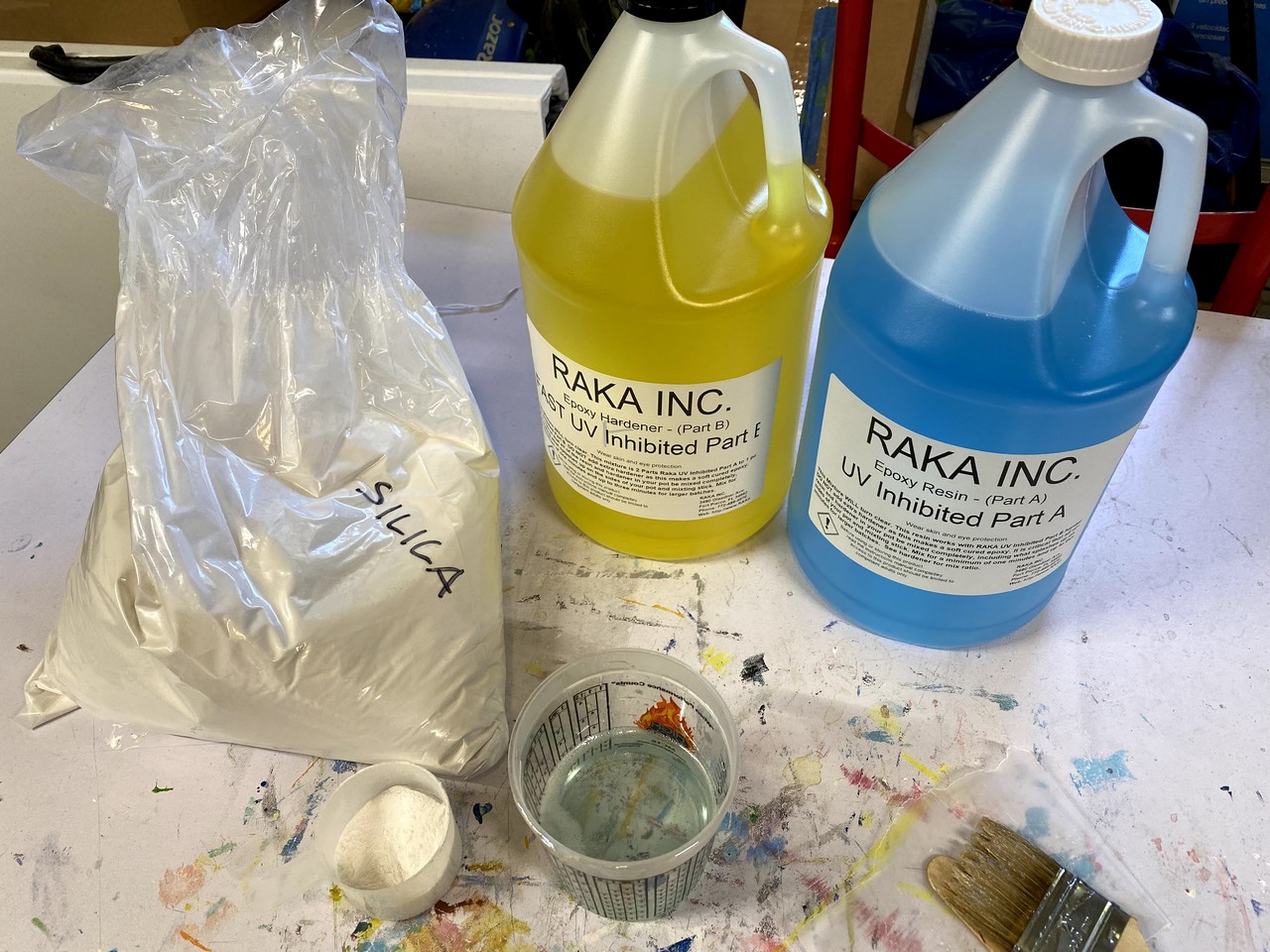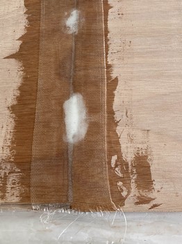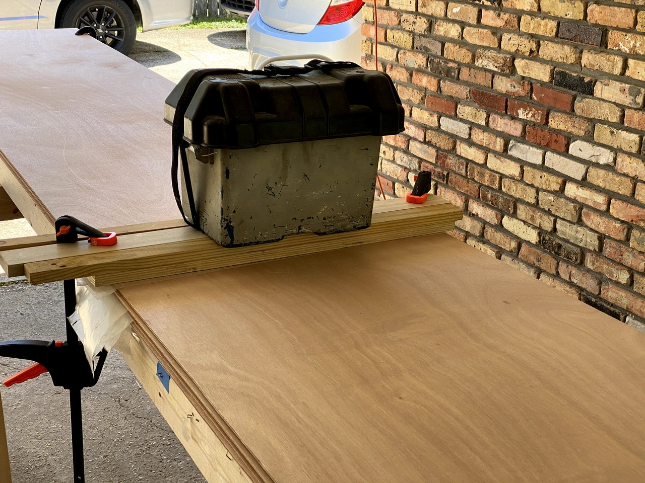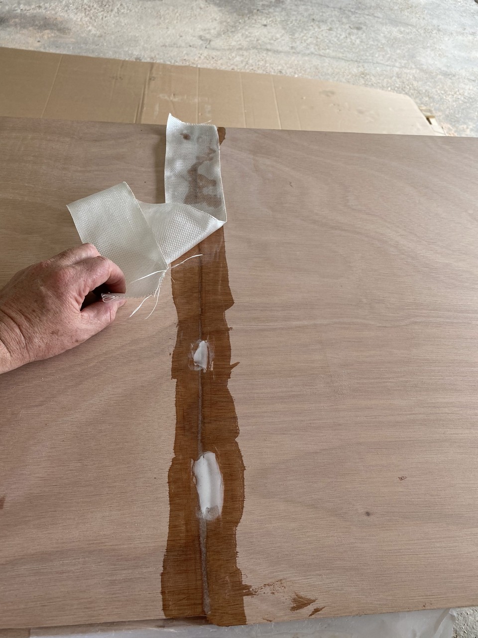 As I said to my wife - “Now we’ve reached the point of no return.” Once these 8’ long plywood sheets are joined to become 16’ long we’ve got issues with where to store stuff, so continual progress will be essential to return our carport to the cars that live there. We glued multiple sheets of plywood together, so we laid them all out with scarf cuts exposed, applied a layer of unthickened epoxy, and let it soak into the wood grain. Next, I mixed a batch of epoxy thickened with silica which yields a white colored plastic. We couldn’t work fast enough to stay ahead of the curing in the mix pot so I experienced my first epoxy error - mixing too much at once. So, mixing a smaller batch with silica thickener we continued basting the scarf areas with epoxy and then joining the panels together. We picked one edge to be our alignment edge and used a string to make sure the sheets were straight when glued together. Since we’re gluing 2’ x 8’ sheets instead of factory cut pieces we could be a little more lenient in the exactness of the alignment. The multiple sheets were stacked on top of each other with a layer of wax paper in between, and then lightly clamped down on the two sides.A car battery was set on top in the center for some added weight. The epoxy was allowed to cure overnight and we turned our attention to transferring deck patterns to the thinner 3mm ply.