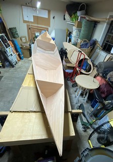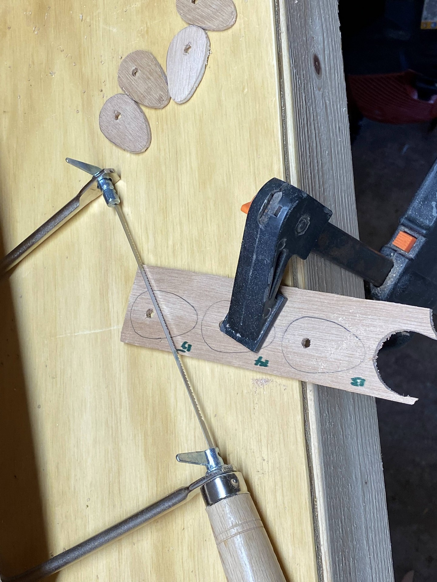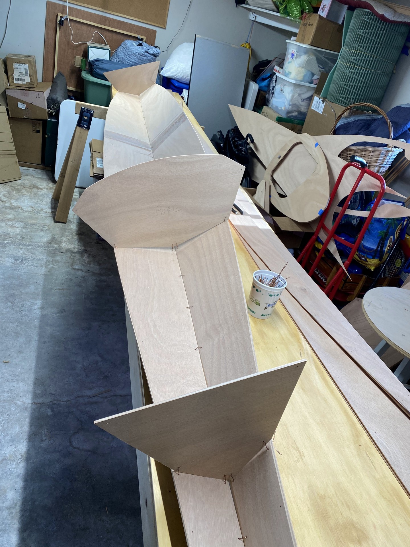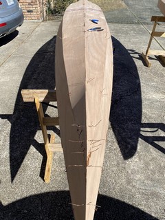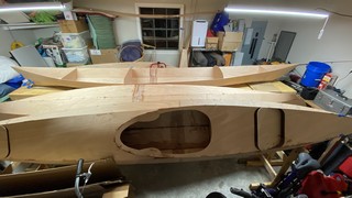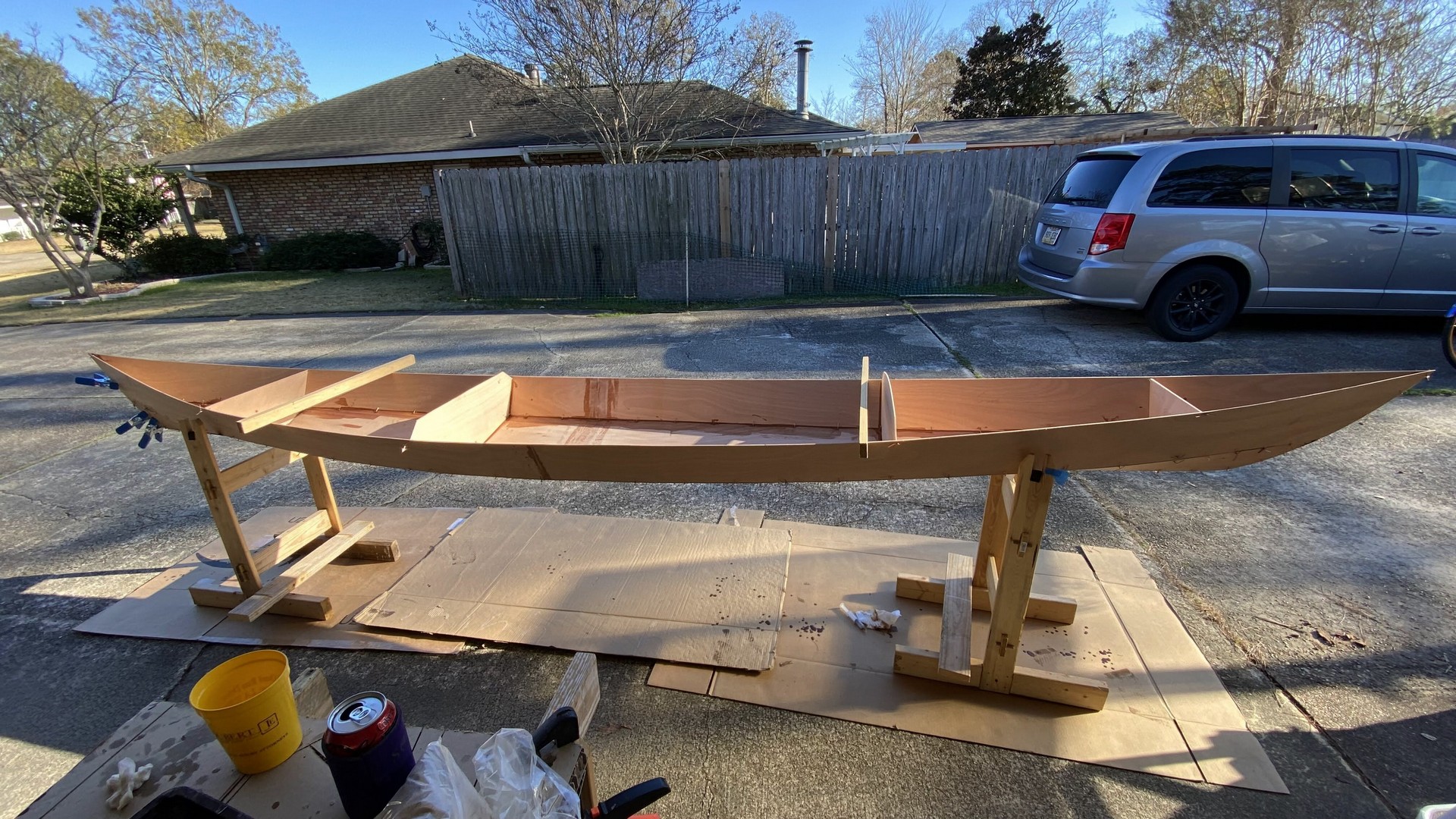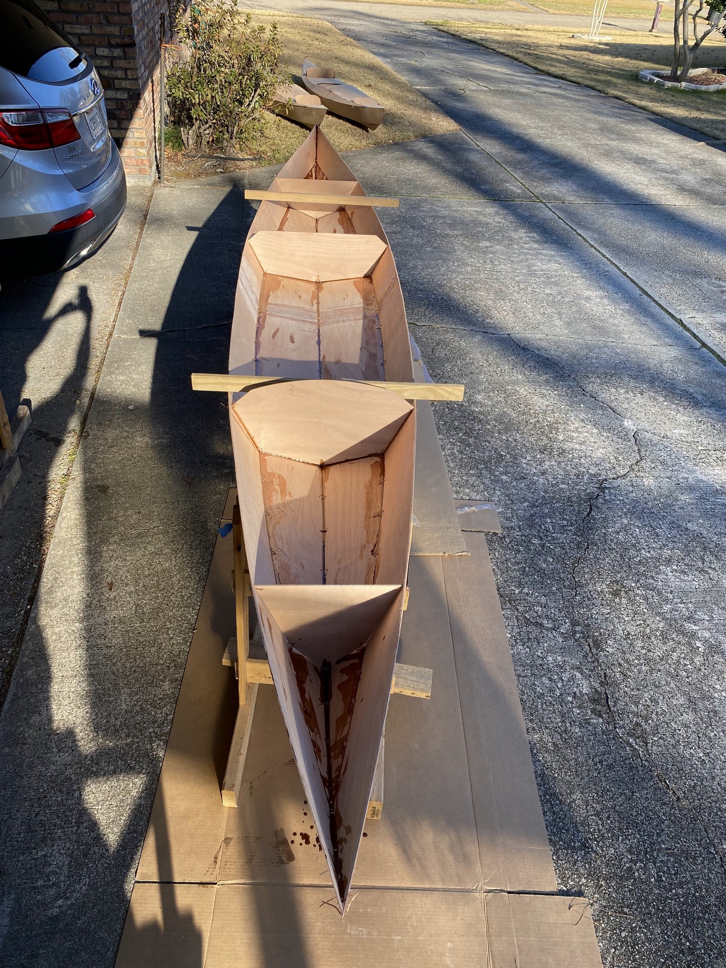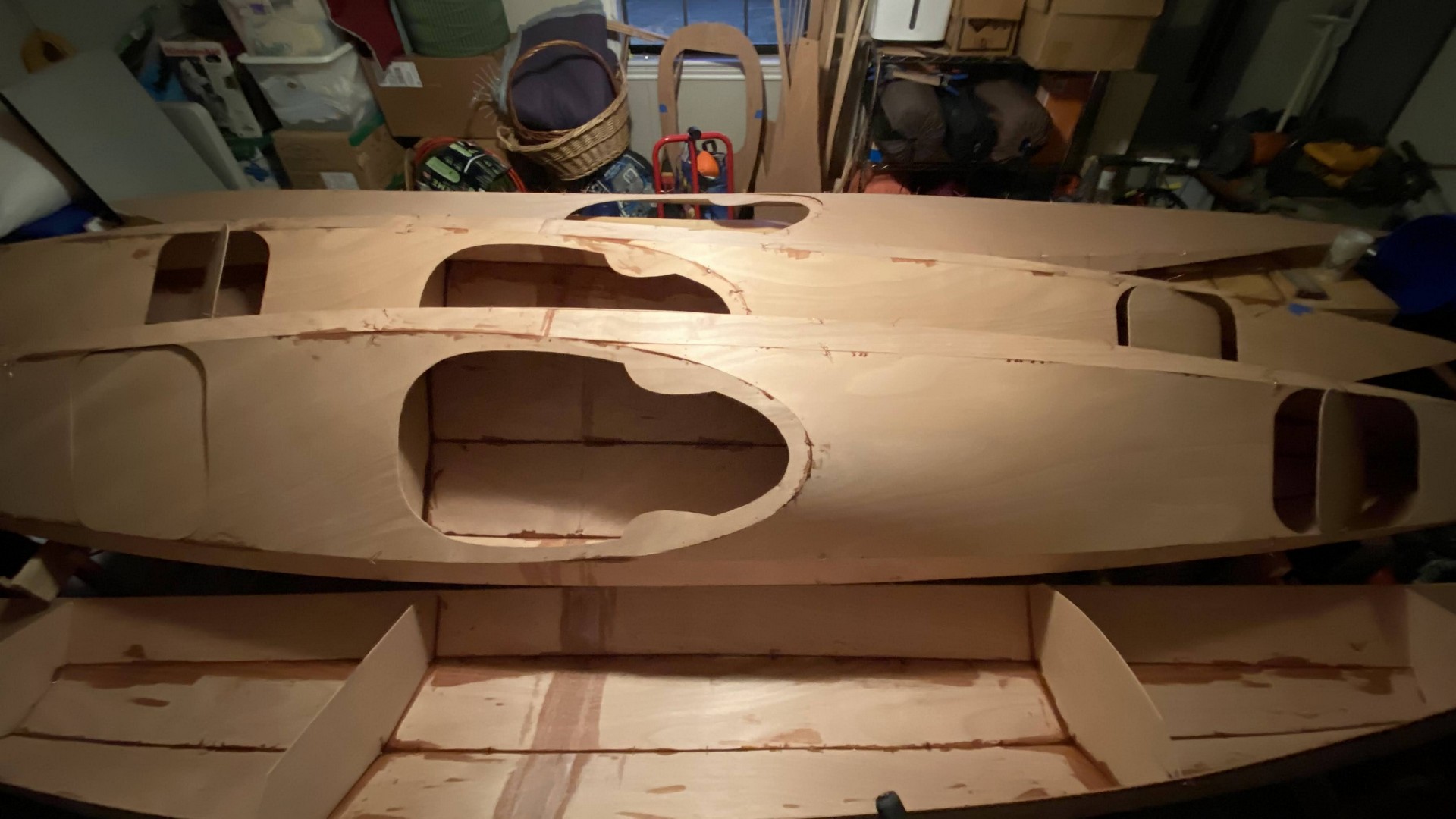 During intervening weekdays the cold temperatures or rain prevent progress with epoxy so I turned to reading ahead in the builder’s guide and various instructional videos and online discussion forums. I was seeking to make progress without requiring epoxy work. Several carpentry tasks I knocked out included cutting out cockpit hip braces, making toggles to hold down the hatch covers, and the cockpit seat backs. I discussed the seat backs in the previous blog post. So far this plywood bending attempt isn’t going very well so I’m going to have to steam the plywood.