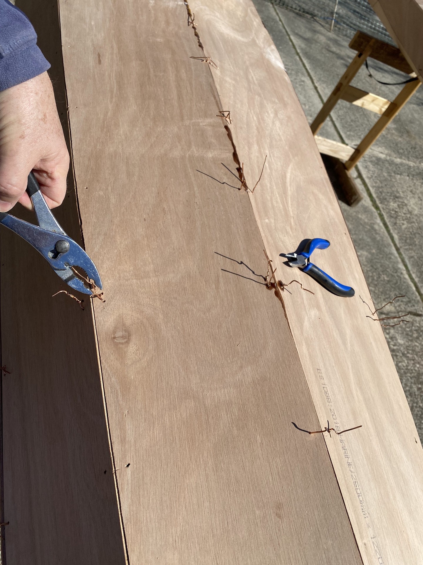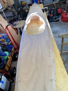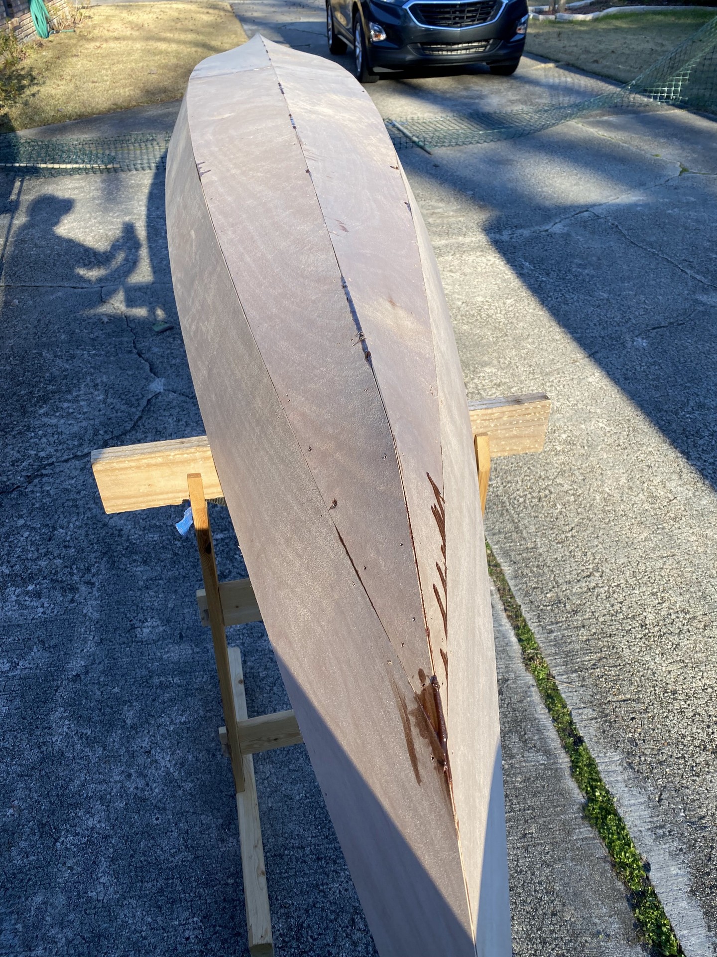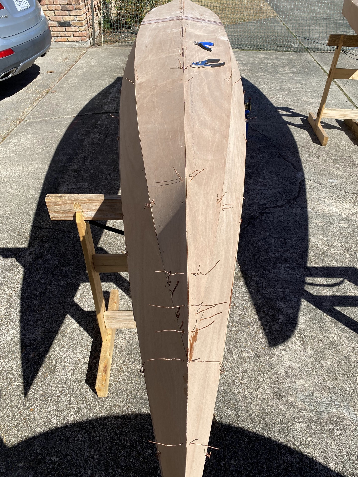 I wanted to keep the progress of all three kayaks on pace with each other, so I stitched together the hull of kayak #3 of 3. The following weekend I continued with loosely stitching the deck panels on a chilly Saturday, and then had the opportunity on Sunday to tack weld the hull together as we enjoyed warmer temperatures which allowed the epoxy to cure. On the other two boats I removed all wire stitches except those joining deck to hull. I used a blowtorch to heat the copper wires and then pulled them through the cured epoxy, often snipping them in half on the inside of the first. Some builders leave the wires in and sand them flush. I want them out.