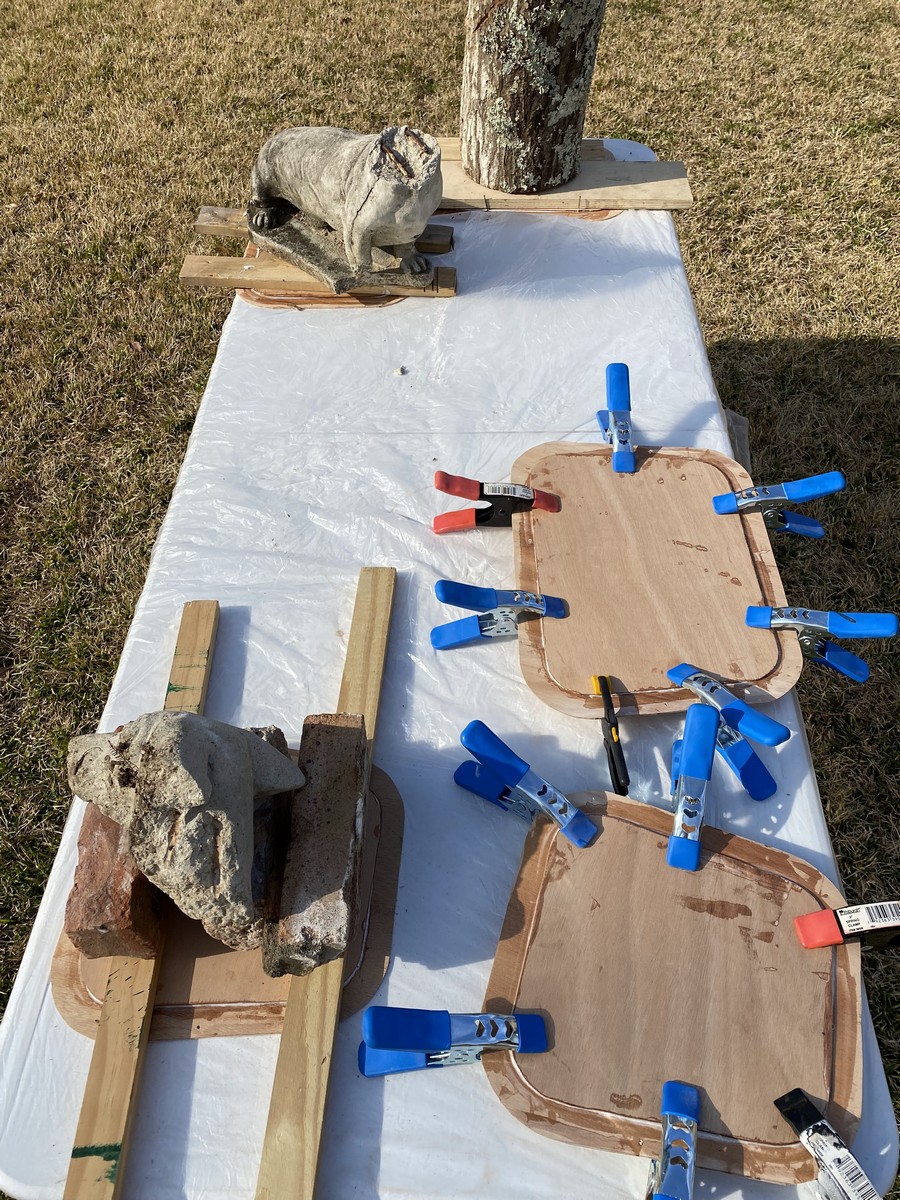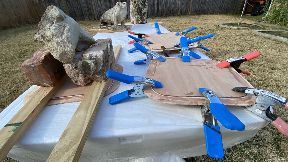 The warm weather during the second weekend of February allowed me to mix up some epoxy with silica, making a glue paste for gluing the hatch lids to their matched lid doubler. The doubler is simply a second sheet of okoume plywood roughly 1" smaller in all dimensions around the edges. Bonded to the middle of the lid, the doubler adds strength and rigidity to the hatch covers. I applied the epoxy fully to both plywood surfaces using a plastic squeegee. Not having enough clamps for three pairs of hatches, I used objects including bricks, a log, and car batteries resting on top of scrap lumber to distribute the weight across the hatches on a sturdy table. (See photos below.) I laid a sheet of wax paper between the hatch and the stock lumber to ensure no sticking. As the epoxy began to cure it oozed out the edges around the doubler so I kept having to remove all of the weights or clamps to gain access and remove excess epoxy with my squeegee. After about an hour the oozing ceased and I was able to relocate all of the glued hatches to my work table inside my storage room, replacing the weights on top of them, where I left things to cure overnight.