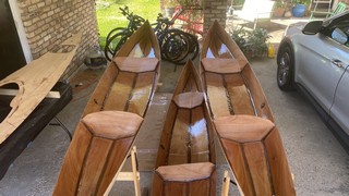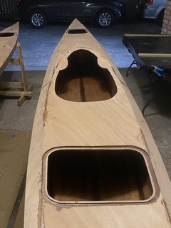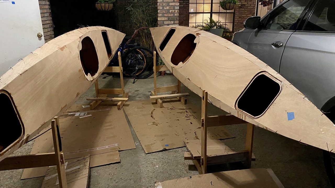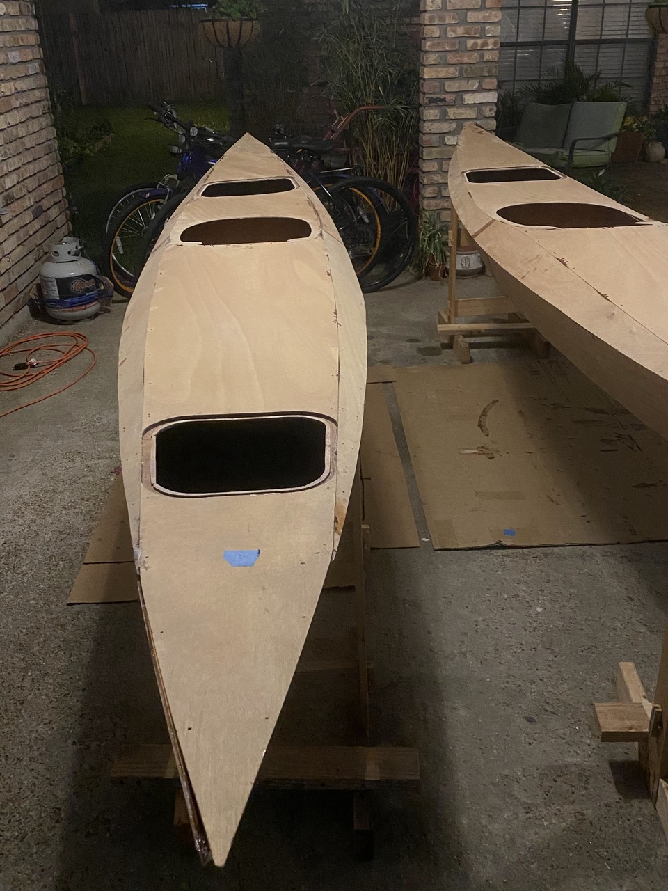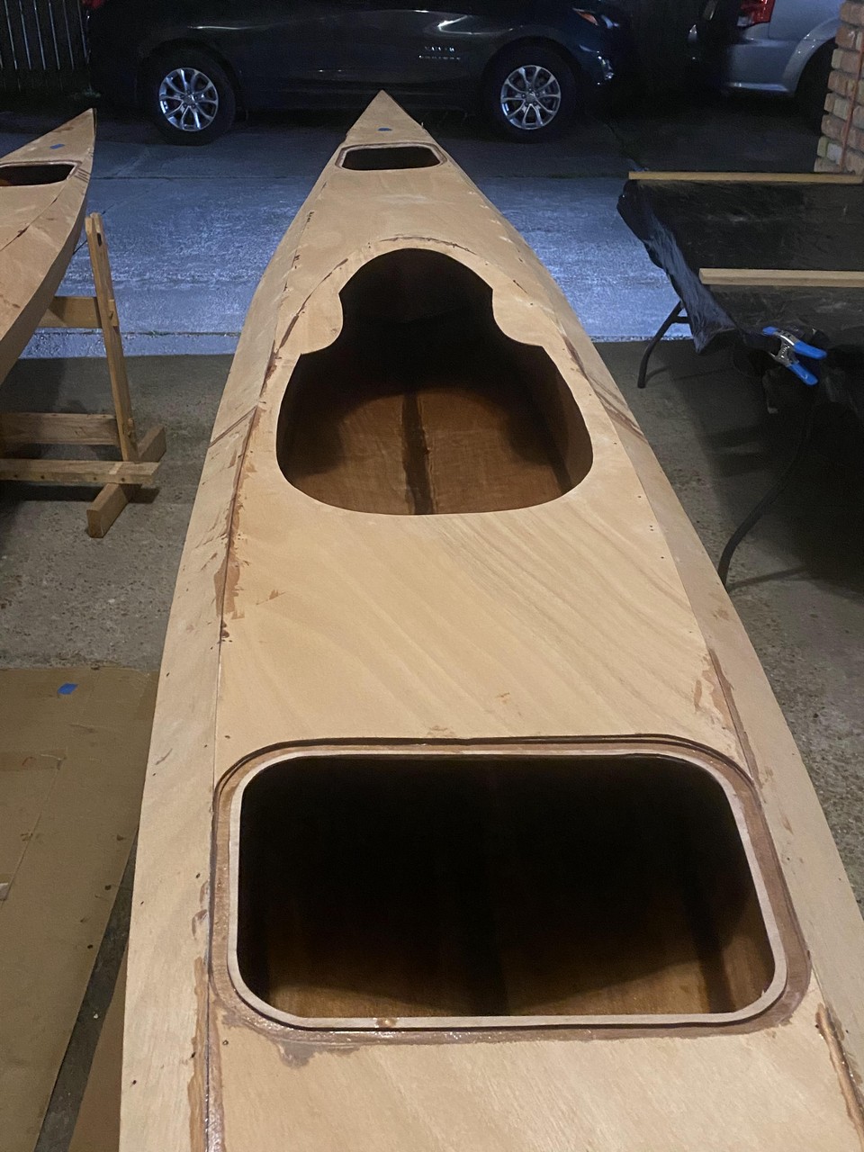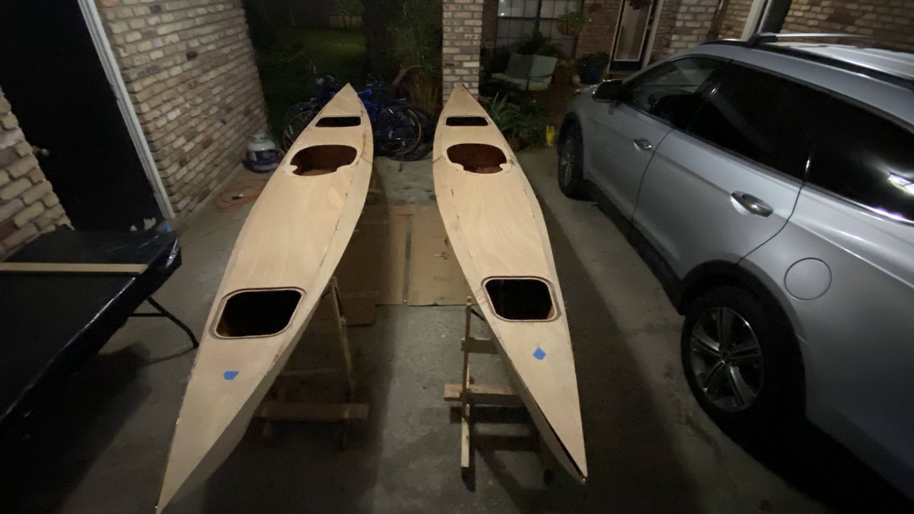 We’re really building boats! Work was completed on the interior of decks and hulls, allowing the pairs to be bonded together - forever taking the shape of kayaks.