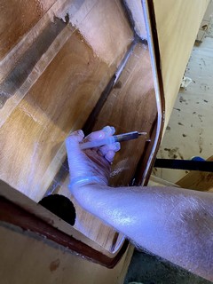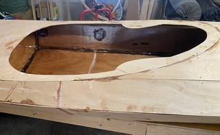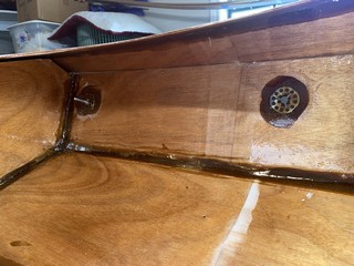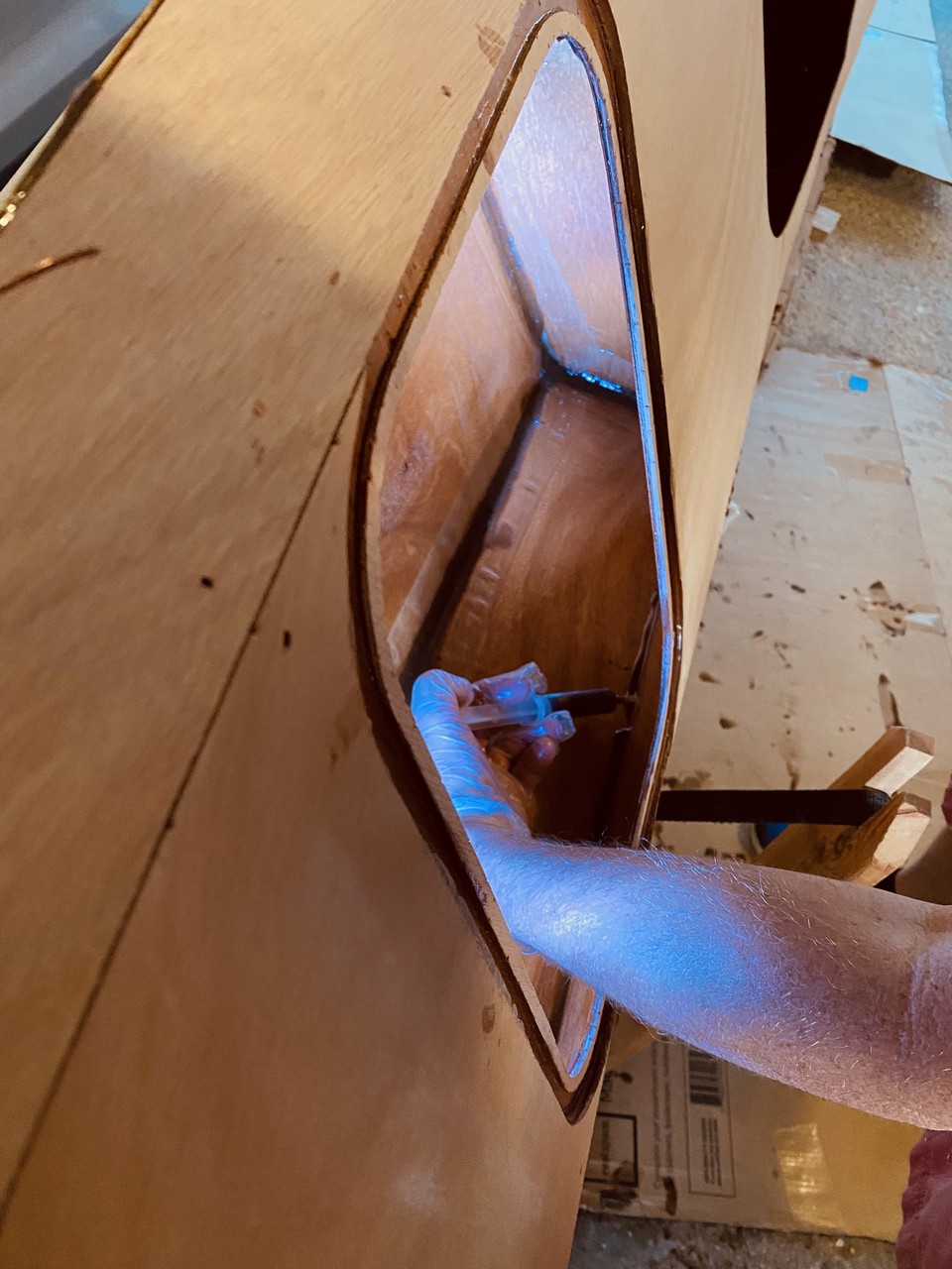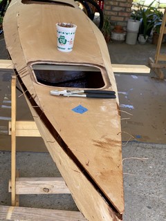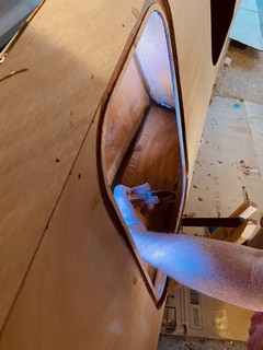 My wife assisted with applying the fiberglass tape to the fore and aft hull compartments after I’d applied the filets. Timing of the application of the fiberglass is (I subsequently learned) critical. Do it too soon when the epoxy is still wet and the tape will stick - sometimes in the wrong place - and you’ll have to pull it up and lay it back down again. This results in a brown stain in the tape from the wood flour. In other areas I waited too long and we couldn’t get the fiberglass cloth to completely lay down in the joint. This resulted in bubbles forming which later had to be cut and sanded out to allow future epoxy layers to penetrate the voids. Some builders seeking pristine filets allow their perfectly formed filets to fully cure. Then, they sand to roughen the surface and apply the fiberglass tape with clear epoxy resulting in a more attractive look. I could justify this time requirement for the cockpit interior, but not for other areas.