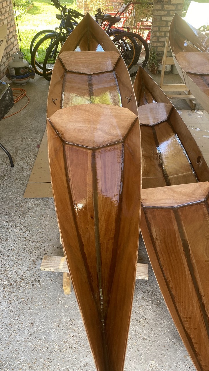 These are perhaps the most readily avoidable errors and are compounded for me trying to build three at once. Ideally, I’d use painter’s tape to mask the filet areas before applying them. Striving to make progress, I couldn’t be bothered with this step and will tolerate some dark stains inside the boat from the wood flour thickened epoxy. Some but not all were sanded out before applying the fiberglass and clear epoxy coat.