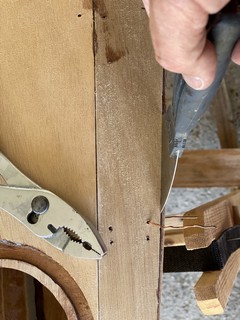 First I wired hulls to decks, sanding and filing the joint occasionally to improve the fit along the sheer line. The manual suggests a flat screwdriver, but I prefer a wider putty knife and/or drywall mud spreader to pry and align the deck to hull as I tighten the wire stitches. It spreads the force along a greater area and so doesn’t mar the wood.