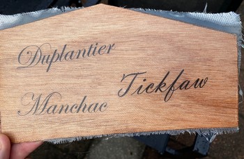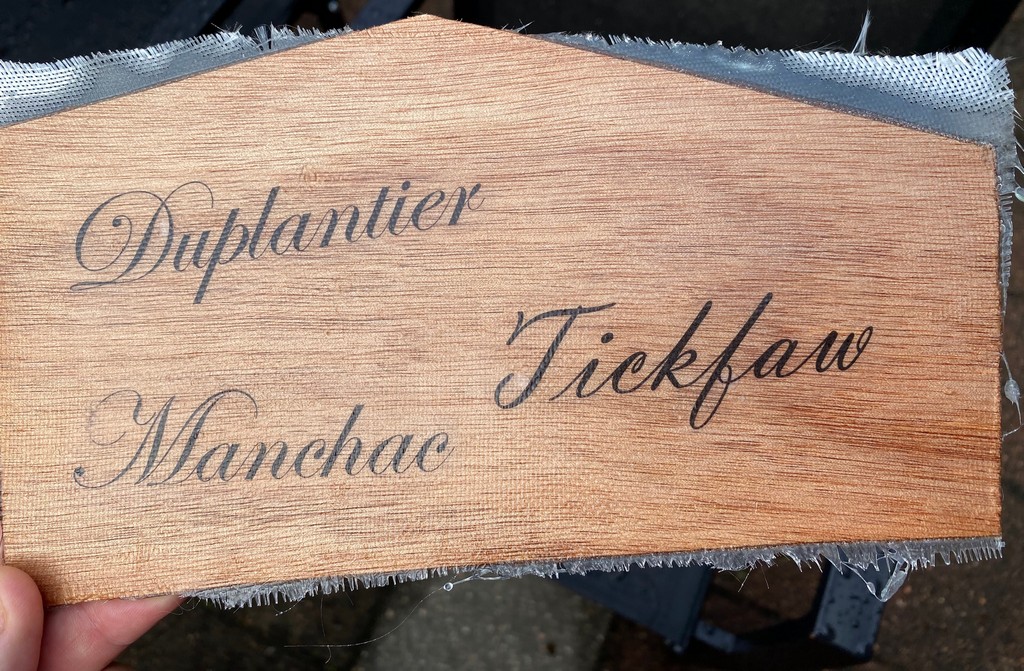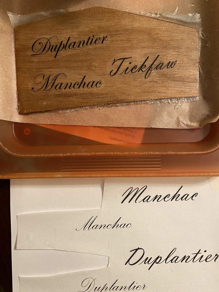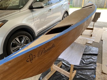 My sons and I went through a process of listing and selecting names for our kayaks. I like regionalism, so I proposed using names of local bayous or French terms used in south Louisiana. They agreed, made their choices, and I printed full-size tests using various script fonts. Once satisfied, I used our black toner laserprinter to print the names and some fleur-de-lis graphics onto rice paper. This I purchased at Hobby Lobby as a roll, cut sheets to size, and taped them at the corners to sheets of legal-size copy paper and ran this through the printer without incident.