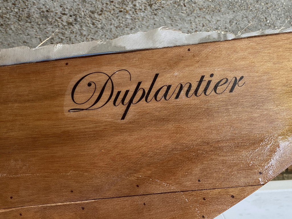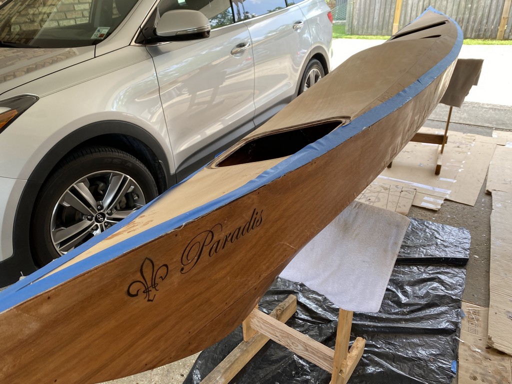 I cut out the names from the rice paper and applied these to the sanded kayak hulls beneath the fiberglass. When wet out with epoxy the rice paper nearly disappears.