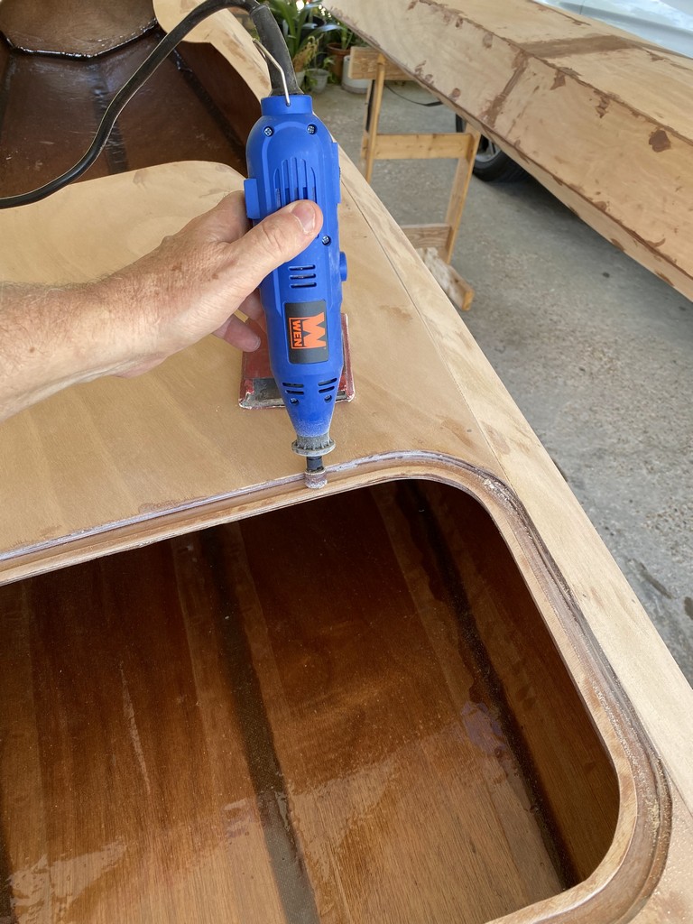 I broke down and bought an off-brand dremmel tool which was helpful in cleaning up epoxy runs and sags around the hatch rims. This ensured I have a uniform groove for the hatch seal weatherstriping to seat into. I also filled all wire stitching holes in the deck or hull with thickened epoxy before sanding the exterior. Some builders claim this step is unnecessary. I am hoping this will hide the holes as much as possible, although due to the dark color from wood flour this may have backfired on me. I again got in a hurry trying to plug the holes in all boats before my pot of epoxy got warm, resulting in some excess epoxy on the surface where I didn’t wipe off excess promptly. I should have mixed smaller batches of thickened epoxy. One can either spend the time mixing numerous small batches, or you can spend that time sanding off excess that you didn’t wipe in time.