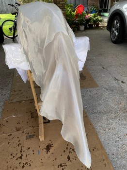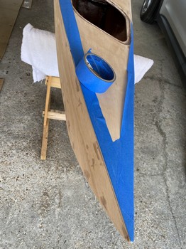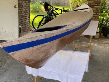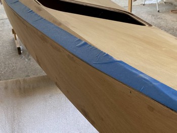 Finally, I was ready for the major step of glassing the hull. Blue painter’s tape was applied to the deck edges at the shearline joint to prevent epoxy from running down onto the deck. I laid out the 5 foot wide cloth from bow to stern, allowing a few extra inches to drape at the tips. The cloth was then pulled as far to one side as possible, leaving only an inch extra. The surplus was cut with sharp scissors, again leaving only an inch excess. When cut in half and switched order, this surplus was now sufficient to provide the 2nd layer of glass on the bottom of the hull. I overlapped it an inch in the middle of the boat, and trimmed it to fit with just an inch overlapping the shines from the hull bottom panels onto the sides. The glass was smoothed out by hand across the entire bottom of the boat, working out wrinkles. Plans call for the addition of a third layer - a 3" wide rub strip across the “V” of the hull at the bow and stern. I elected to wait and add this 3rd layer ribbon of bias-cut fabric later, after the initial application of epoxy dries. I’m glad I did, even if this takes more time, as I had difficulty enough saturating two layers of fabric with resin.
