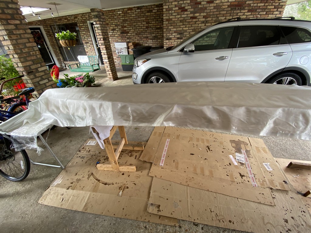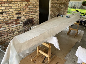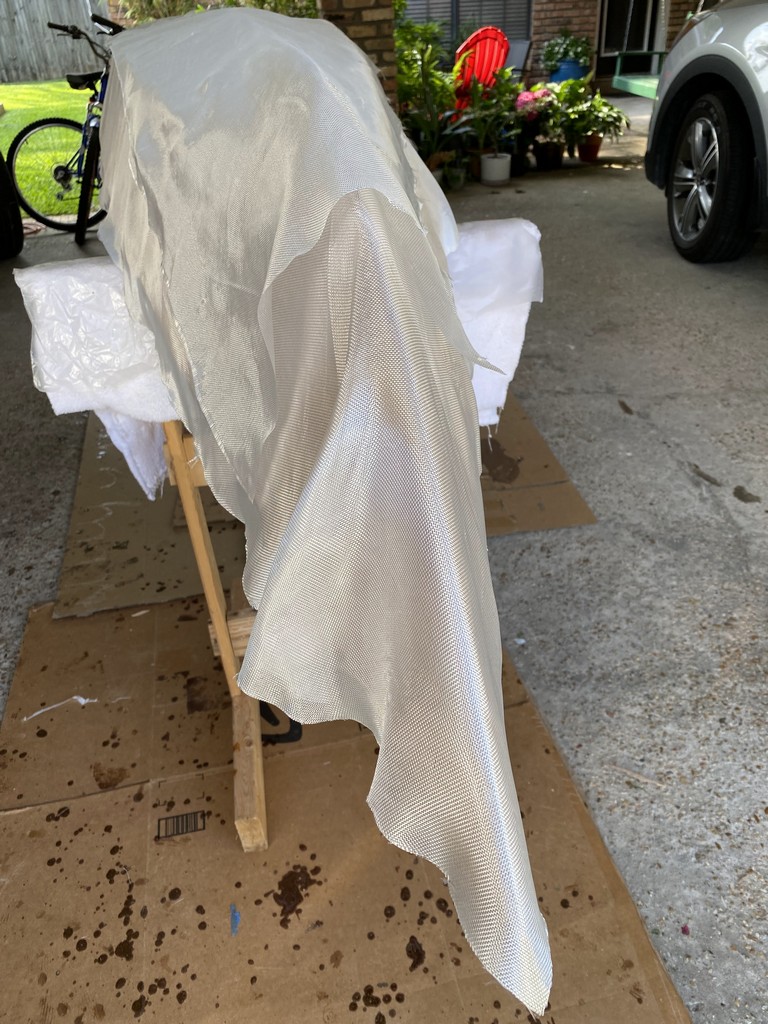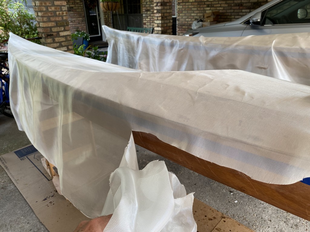 My early error was mixing too much resin at once as I was unable to use it all before the pot grew warm and the resin began thickening. This made it difficult to saturate the fabric so I worked fast in a panic on areas with only a single layer of fabric. I should have just discarded the warm epoxy. On future batches I mixed smaller ammounts and had greater success wetting out the fabric layers easily.