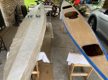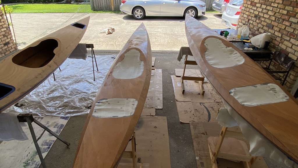 Omitted from the photos here is the intermediate step of - you guessed it - sanding! After the initial encasement of epoxy and fiberglass, the hull and deck is quite rough along the seams, overlaps, and miscellaneous runs I didn’t catch. It took nearly a full day to fully sand and prep the exterior of the three kayaks for their first fill coat of epoxy. The fill coat was applied with a 4" foam roller. I found I couldn’t get all three hulls done before I had to discard the foam nap. It got saturated with epoxy and of course began getting hot while working on the second hull, softening the foam and losing it’s ability to effectively spread the epoxy. The end even separated and fell off. I grabbed a fresh foam nap to finish boat #2 and then the third. Warming naps is less of a problem on the decks as there is less real estate to cover with epoxy so it goes faster, although I did also coat the tops of the hatches at this time.