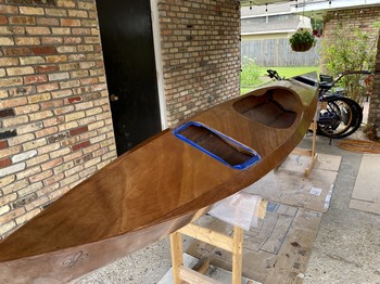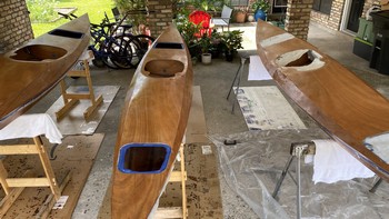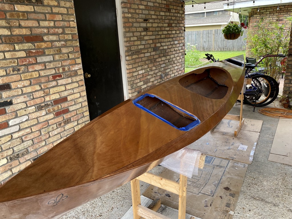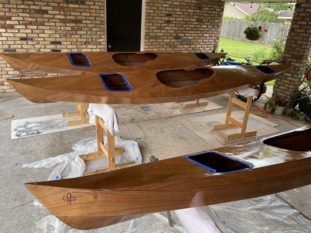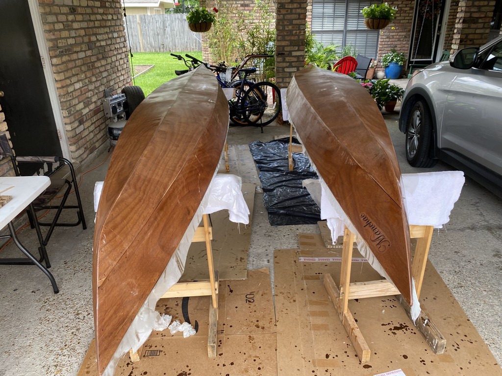 Returning to the boats after the fill coat has cured was satisfying. The beauty of the wood shown through the clear epoxy coat and I can envision what the finished kayaks will look like. Still, there are quite a few steps to go beginning with another light sanding and rolled-on epoxy filler coat.