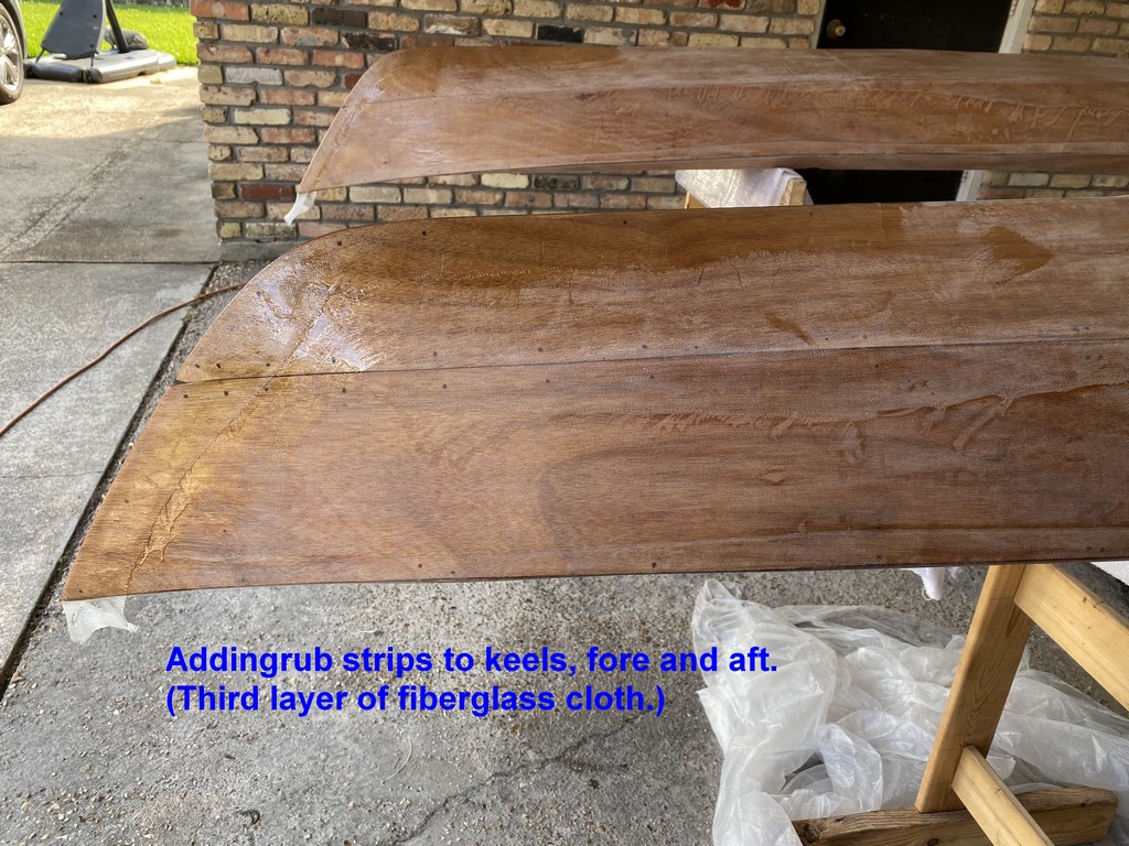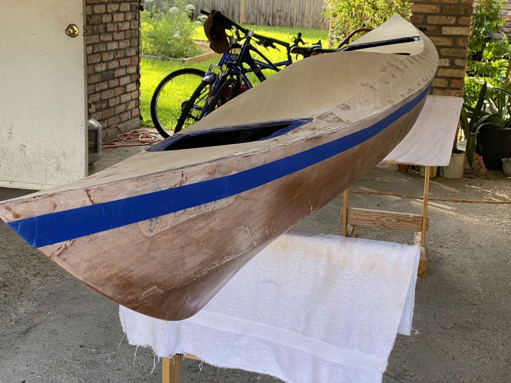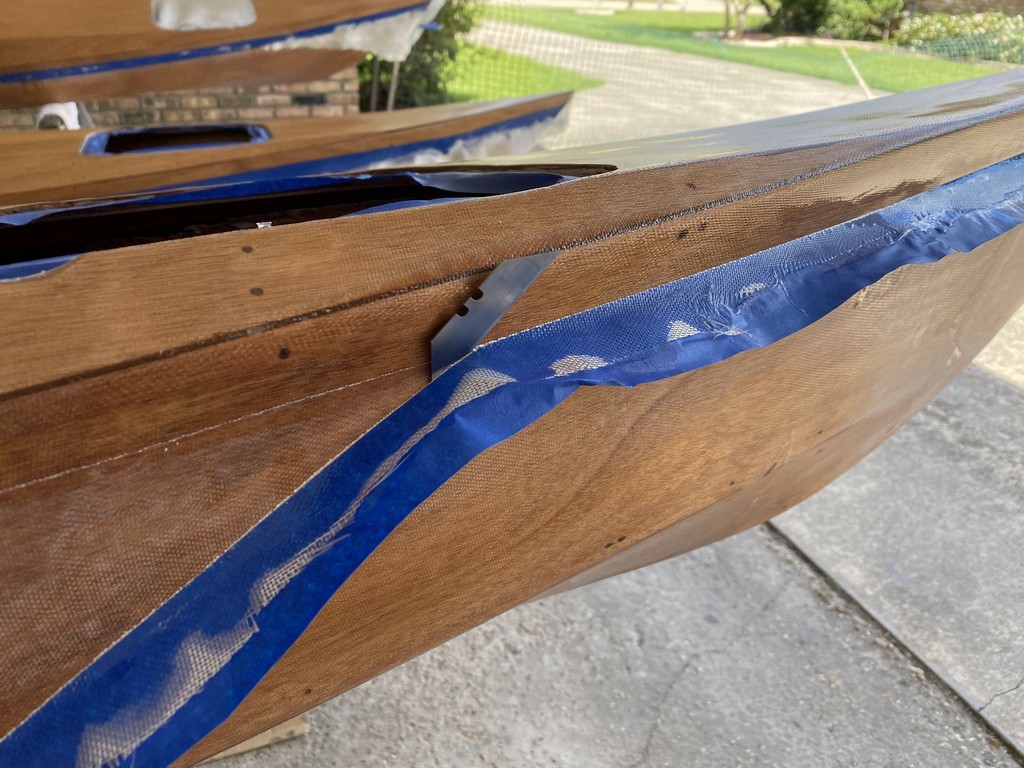 At the bow and sterns of all boats I found I had to cut a dart and overlap the glass on one side of the hull to make it fit the curve of the keel. It overlaps only an inch or two and won’t be noticable after sanding and additional epoxy fill coats.