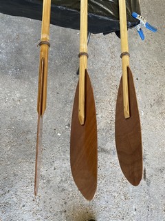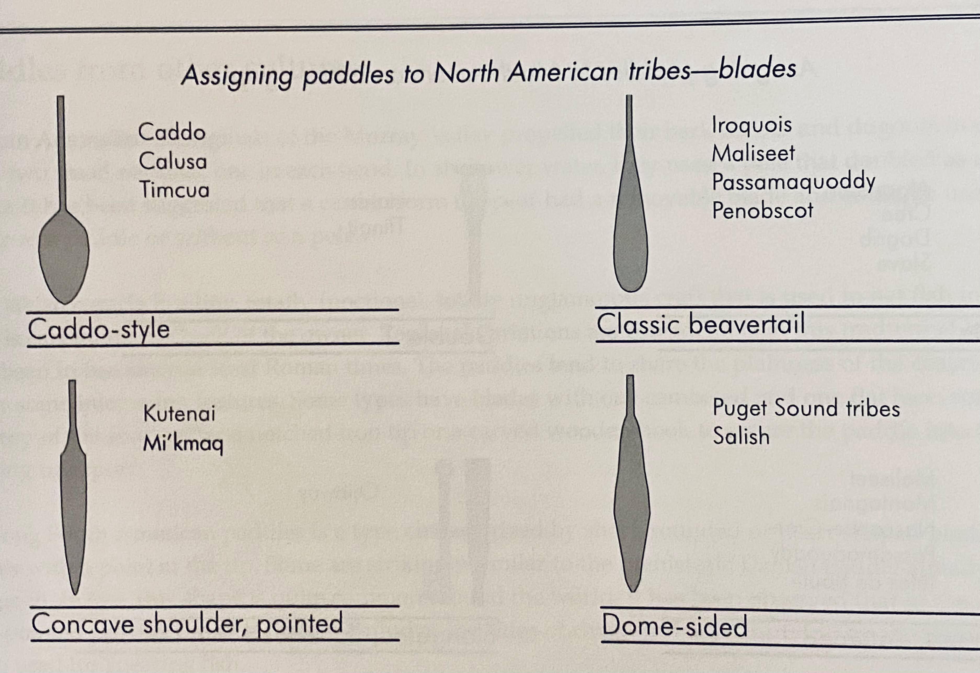 Research for design and fabrication of paddles began in early 2022. At my local library I found a book about wooden paddle and oar construction. The first couple of drawings below are from that book and compare the paddle shapes of indigenous peoples of North America. (Unfortunately, I can’t find the source to credit it.) It is interesting that the southerly tribes - Caddo, Calusa and Timcua - used a more spatulate shaped blade. Generally, that is what I’m aiming for as I’m a child of the south also.