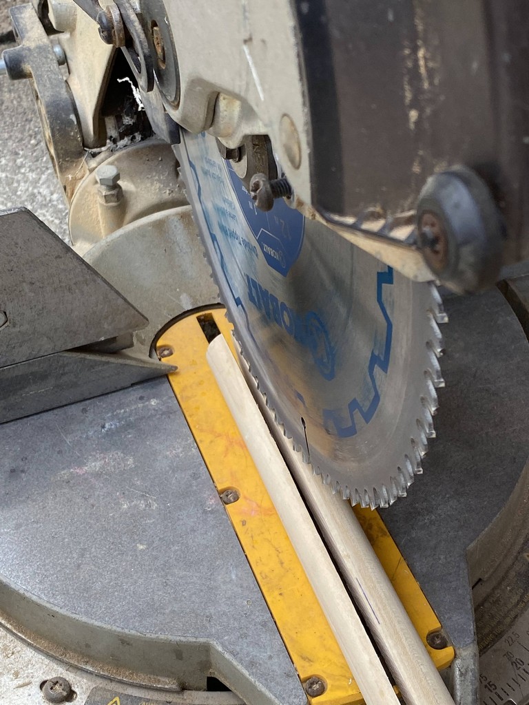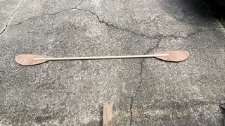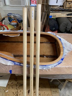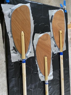 I cut out three pairs of blades for paddles from scraps of the 3mm Okoume plywood. The pattern was obtained by tracing the blade of a commercially available carbon fiber paddle. Next I purchased three 7’ wooden closet rods of 1-1/4 inch diameter poplar from the local builder’s supply. They were only $11 each, and all other materials needed for paddle construction I already possess, so this is the cheapest alternative to purchasing commercially-made paddles. I realize most paddle makers start with solid hardwood and square blanks, but I figured I can get away with something simpler.