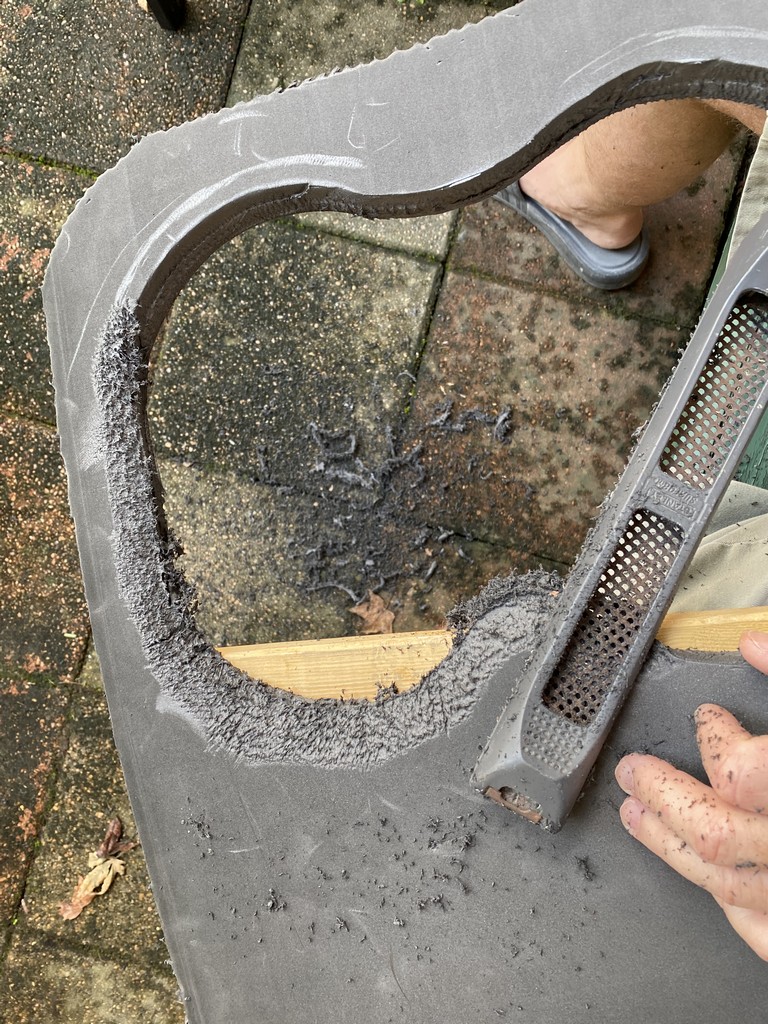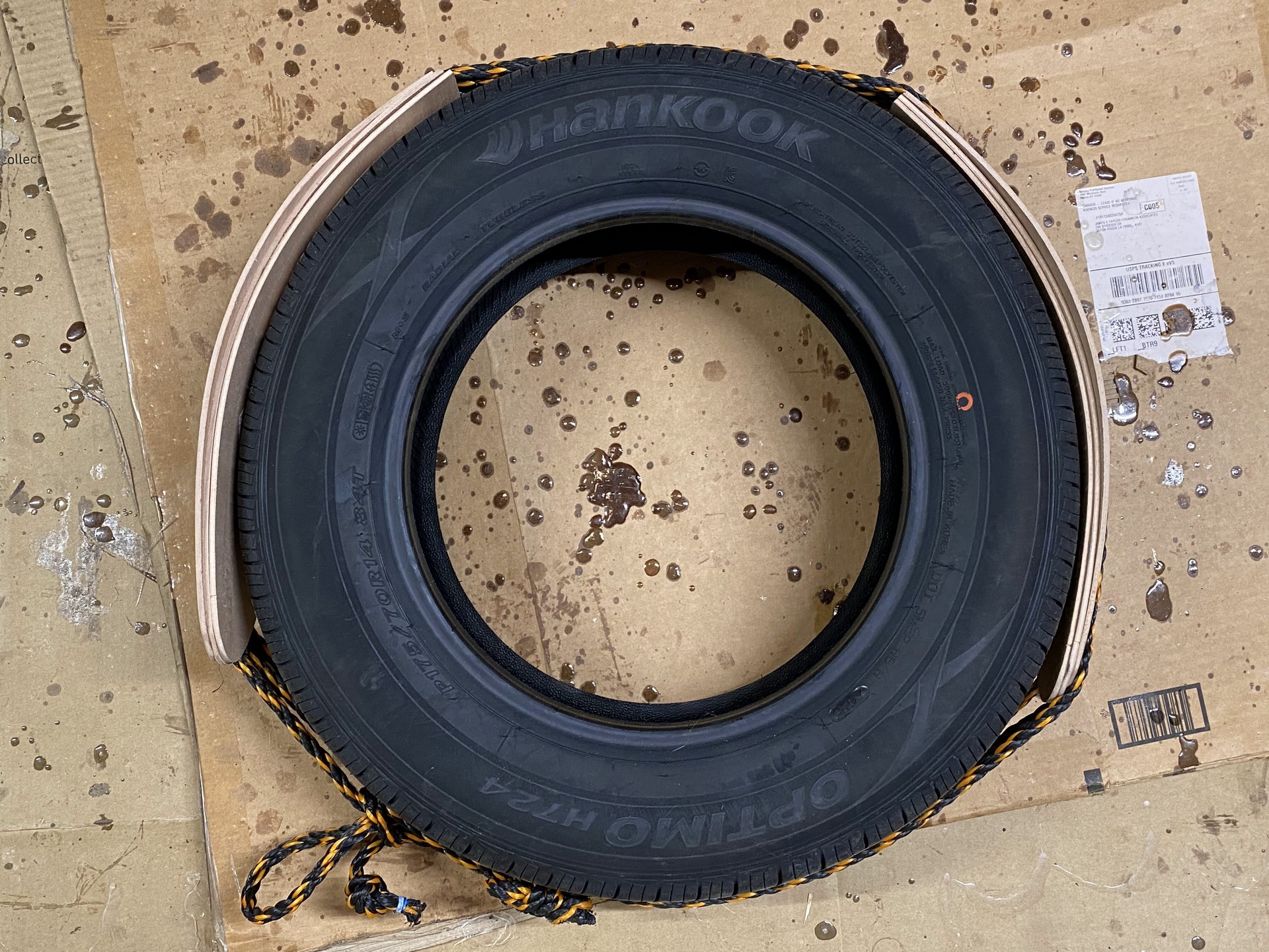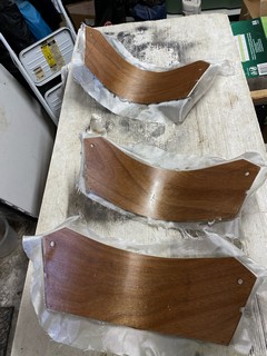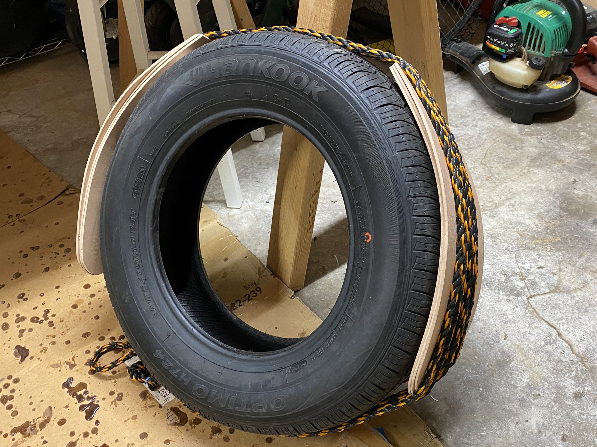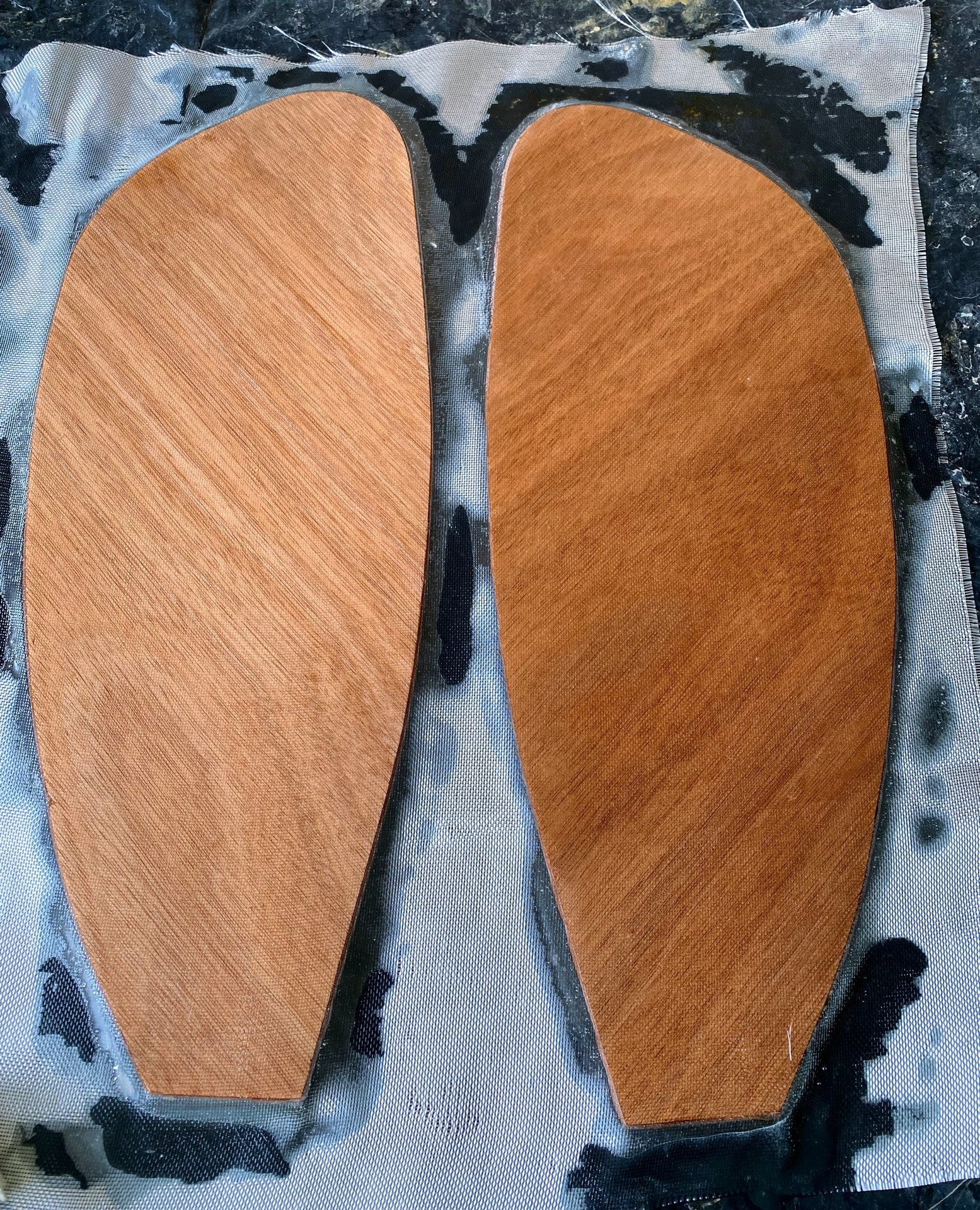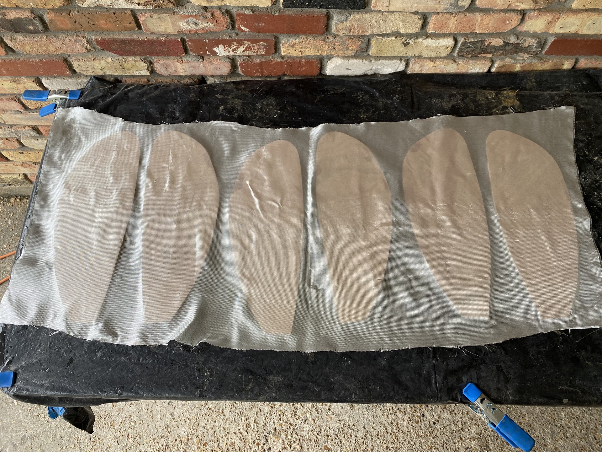 I’m generally following instructions described by Richard Hayes in his Paddling Light blog article. I ended up wrapping the blades around a car tire for a couple of weeks to put a curve in them. Unfortunately, I got lazy, didn’t apply hot steamed towels, and it didn’t work as well as the curved seat backs (below.) By the time I finished applying fiberglass to both faces, the blades were nearly flat again. Oh, well, moving on…