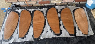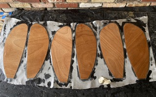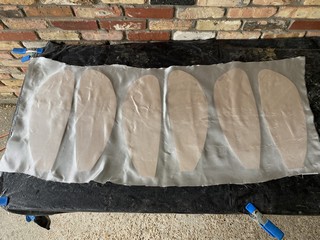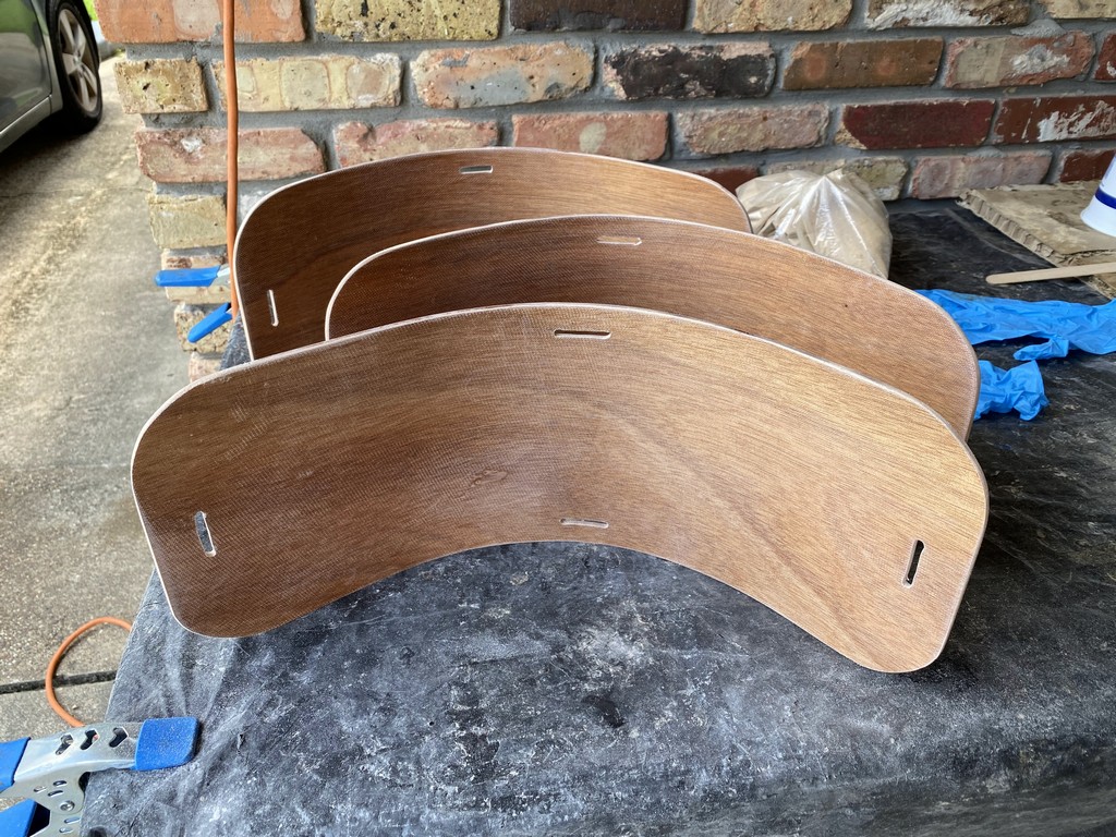 Years ago when considering the Stitch & Glue Cirrus by One Ocean Kayak I purchased Vaclav’s build manual and read about his process of fabricating a seat back from carbon cloth reinforced plywood and epoxy. Loosely, following his process, I eliminated the expensive carbon and proceeded with marine plywood lined with fiberglass and epoxy front and back. Work began on the seat backs in January by selecting three pieces of scrap 4mm Okoume ply and wrapping them around a propane cylinder to put some curve into them. In the end, I believe I put too much curve in them. I’ll fill out their midpoint with some minicel foam.