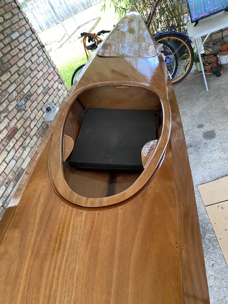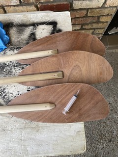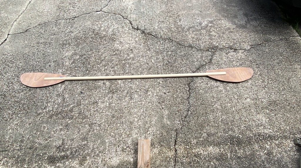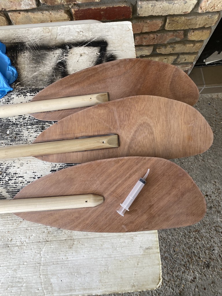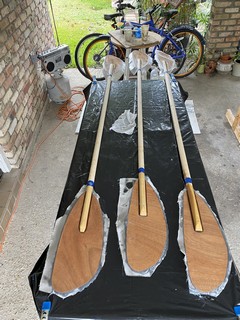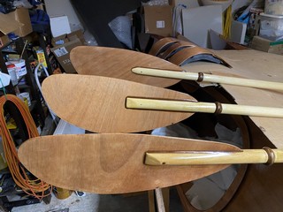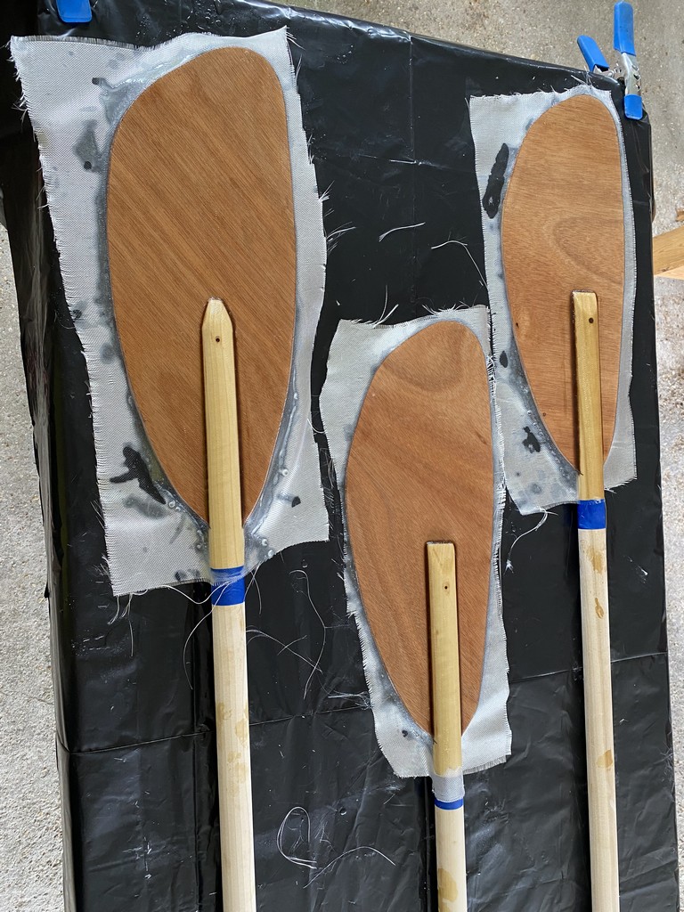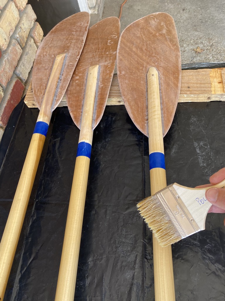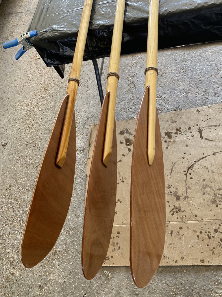 After a light sanding, I applied a second coat of varnish to the paddles as I also varnished the kayaks. Many builders would advise to keep going with more varnish but I’m ready to be done so, for now, two coats it is.