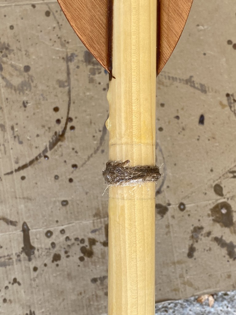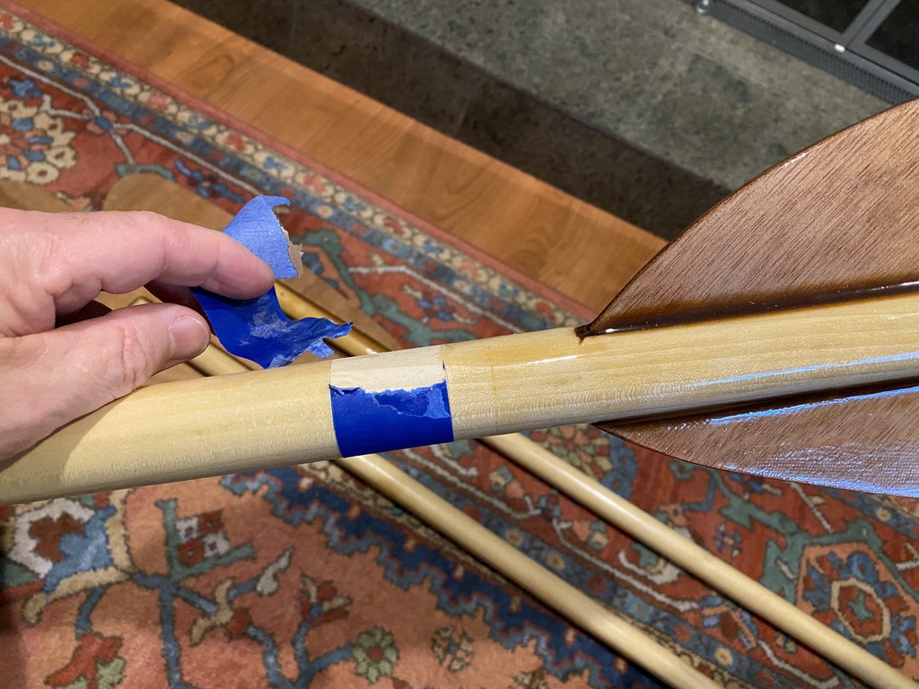 I applied that second layer of epoxy soaked fiberglass cloth across the blades (both sides) mounted in the shafts to further stiffen them. After curing overnight, a final application of clear epoxy was made to fill the weave of the fabric. Next I created drip rings around the shafts by soaking lengths of hemp twine in clear epoxy and wrapping it around the shafts a few inches above the blades. After the first winding set up, I sanded off any high spots and then repeated the process with a second length of epoxy-soaked twine, striving to build the rings up higher so that water would really drip off. It fully cured over the next work week and the following weekend I sanded everything, applied a first coat of varnish.