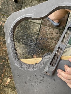 Next I cut 4 slots in each through which the nylon web straps will run. These straps will be affixed to the hip braces and to a block mounted below the rear cockpit combing with bronze screws to suspend the seat back in place.