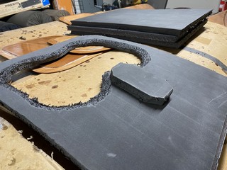 The set of photos below show my process of cutting and sculpting the 1" thick minicel foam to form seats and backrest pads. The seat bottoms are two layers of foam, basically following the instructions provided by CLC in the build manual. The lower layer has a void cut out for one’s tush, and I inserted piece as filler between the legs. Over this I glued another layer of foam. I saved the scraps from the cut-out for use under the cockpit knee braces. Following some advise on a builder’s blog I left the seat pads long (18") so that they extended almost to my knees and support my thighs. I figured I can always cut them shorter later if desired and I won’t glue them down in the boats until I’m satisfied.