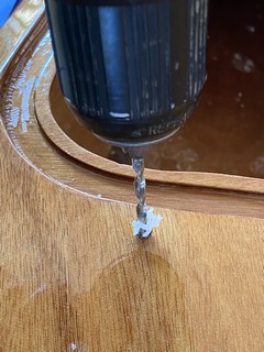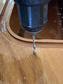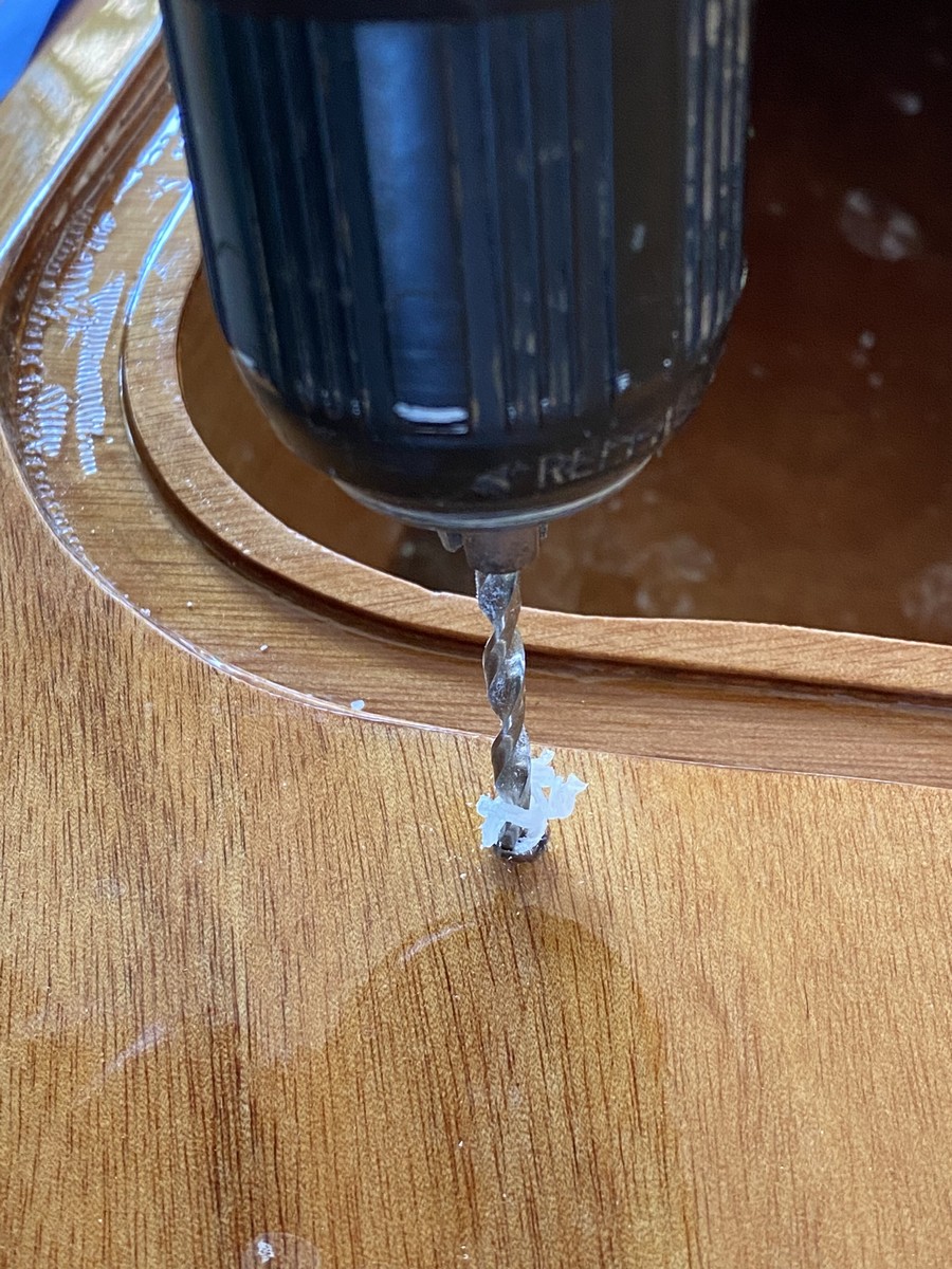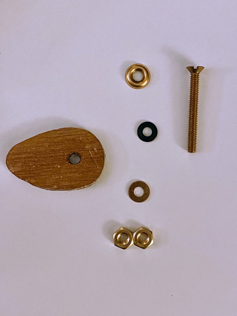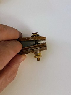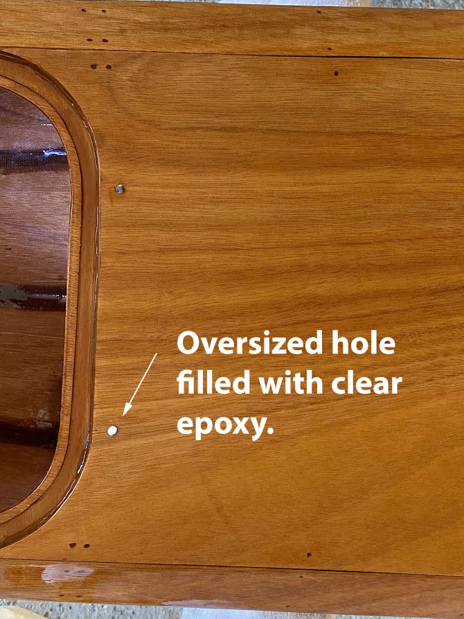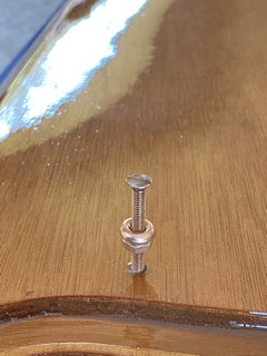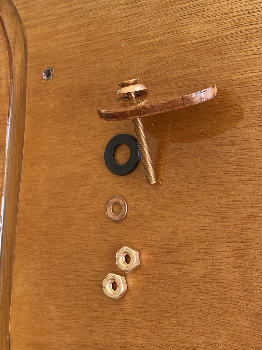 I’m using silicon bronze hardware purchased from Fairwind Fasteners to install the toggles, and as described in a previous post I used the “drill-fill-drill” method of providing through-deck holes fully encased in epoxy to seal the wood. I used 1-1/2" long #8 flat head machine screws which ended up being 1/2" too long. The picture below shows the series of washers. From top to bottom they are: