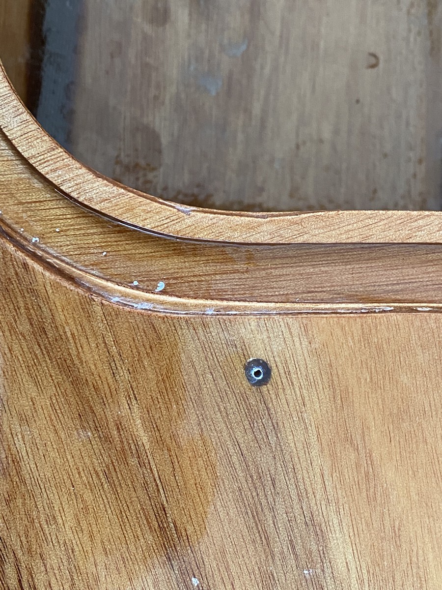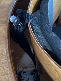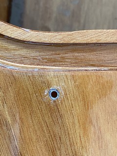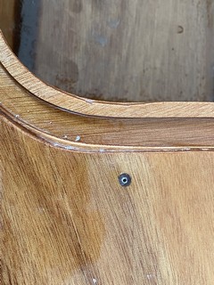 The curved okoume seat backs already had foam glued to their front faces and I’d cut four slotted holes in the plywood of each. I cut short lengths of nylon webbing, fed it through a slotted hole, and then used my rivet tool to secure the webbing to itself forming a loop. Silicon bronze wood screws (#6 1" long) with cup washers were used to secure the loose end of each side strap to the top of the hip braces on either side. Recall in July (blog post #15) that a small wooden block was epoxied to the back of each hip brace at a previous step just to receive this screw.