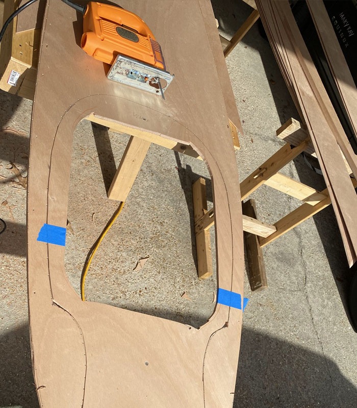 Measure twice…cut once! We begin the careful process of cutting the components for the kayaks from plywood sheets.